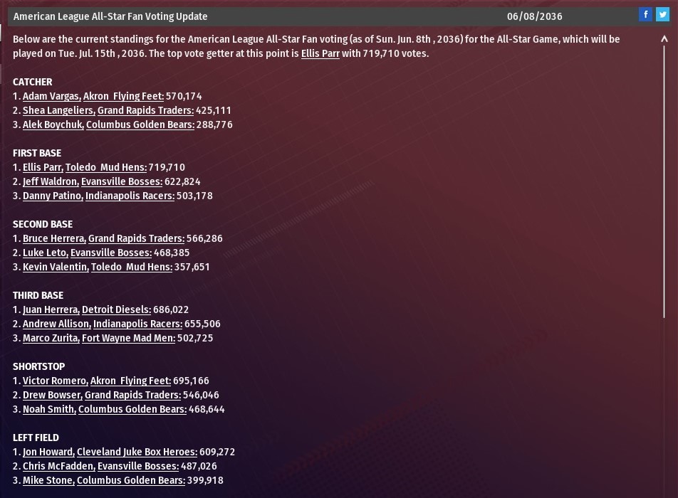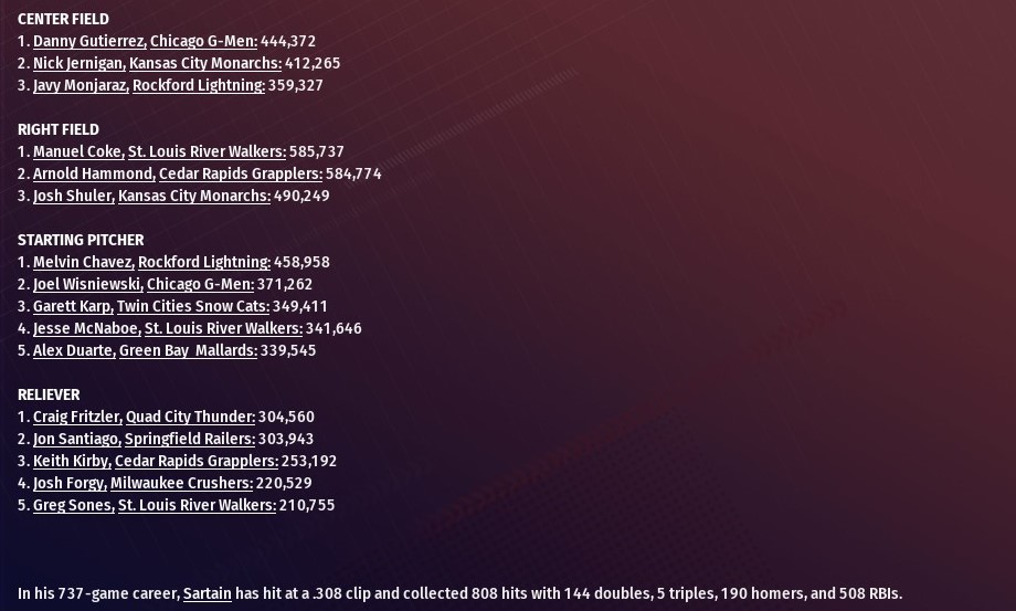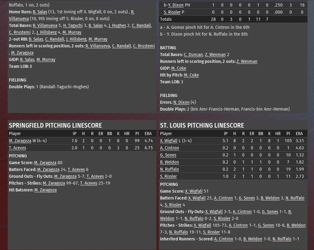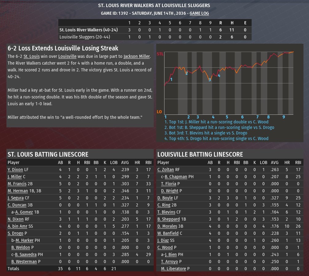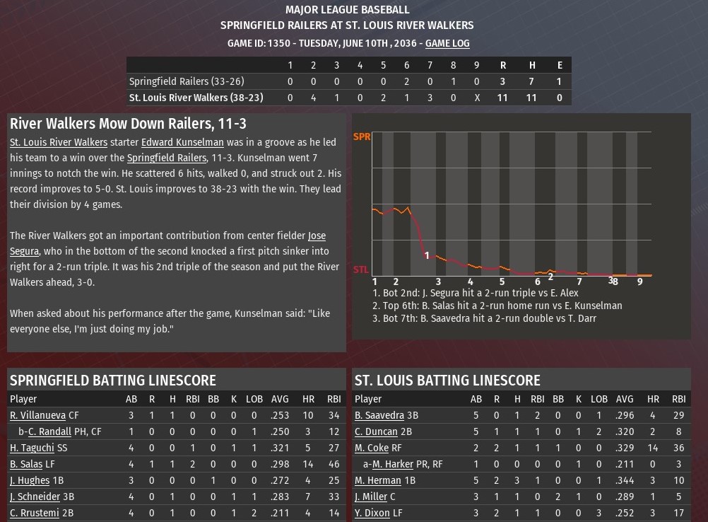 Manuel Coke homered twice and drove in three runs while St. Louis hit four home runs altogether to pave the way for a 9-2 win over Milwaukee at Miller Park (2020). Down 1-0, the River Walkers took the lead for good in the top of the fourth inning against Crushers starting pitcher George McCardel. Marcos Francis struck first with a one-out homer over the wall in center field. Jackson Miller and Bob Saavedra followed with consecutive singles. Miller scored when Abdul-Nasser bin Amr reached on an two-out error by third baseman Jim Sukut. St. Louis increased its lead to 3-1 in the top of the fifth when Coke hit his first homer of the game. It came off McCardel. A homer by the Crushers Jose Nieto off Walkers starting pitcher Shane Drogo in the bottom of the fifth made it 3-2. But Milwaukee would not score again. While the Walkers would. Nathaniel Dixon had an RBI single off McCardel in the seventh. Dixon later scored on a two-run homer by rookie Mark Herman off reliever Tony Lujano. St. Louis busted it open with a three-run eighth. Herman had an RBI single off Brian Stewart to score the first run. Coke later hit a two-run homer off Stewart to cap the scoring. Drogo (8-2) lasted just five innings, he exited after allowing a lead-off double to Rogelio Mercado in the sixth, and allowed two runs on four hits. He struck out eight and walked one. Brennan Weldon took over in the sixth and got out of the inning without allowing Mercado to score. Nick Ruffalo retired all six batters he faced in the seventh and eighth. Scott Rissler pitched a scoreless ninth. |