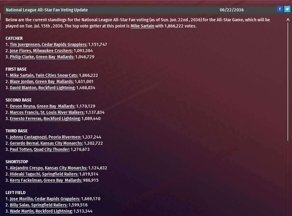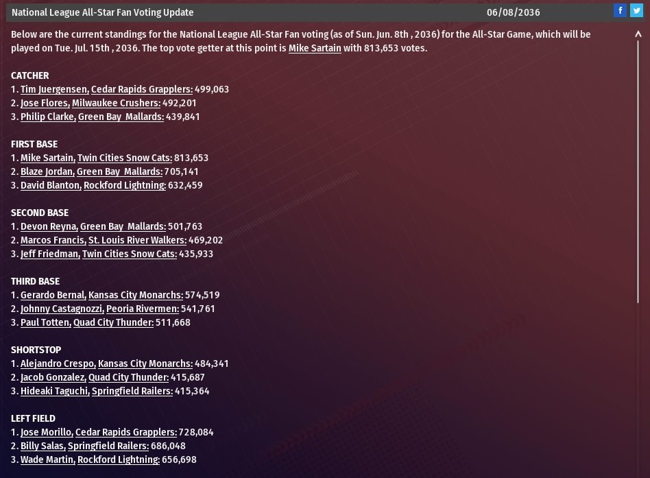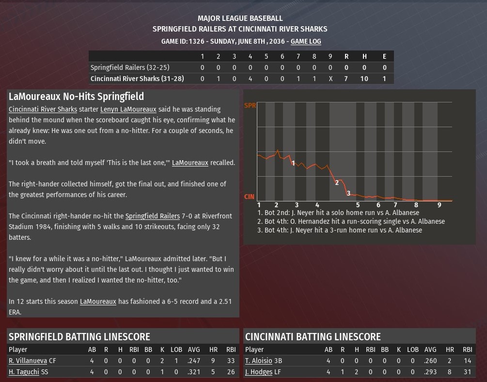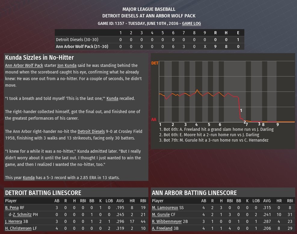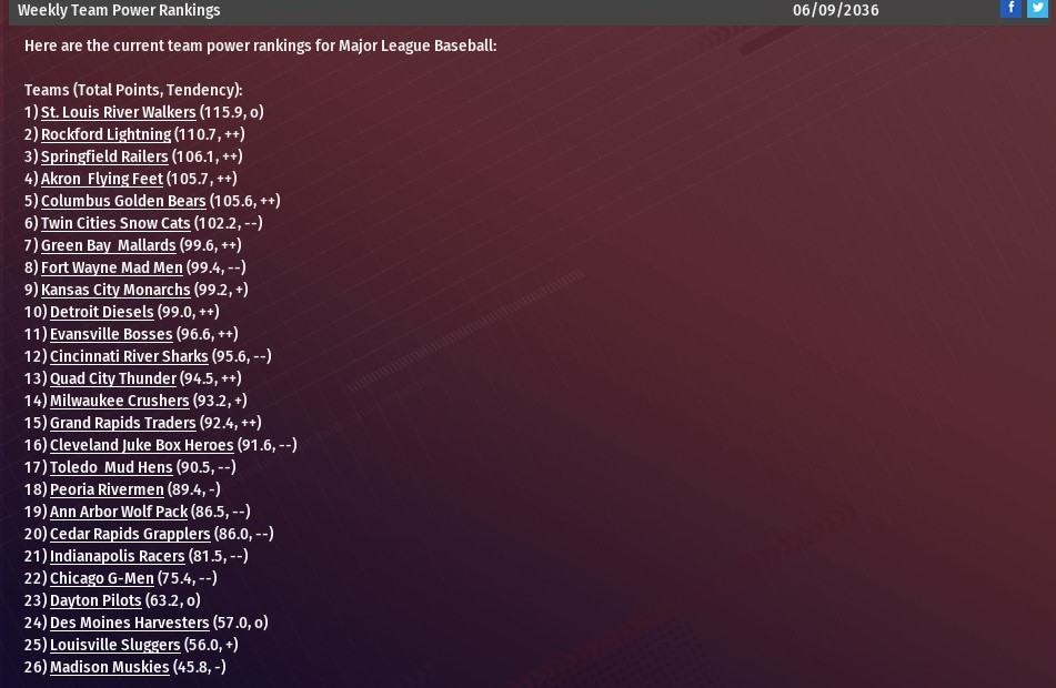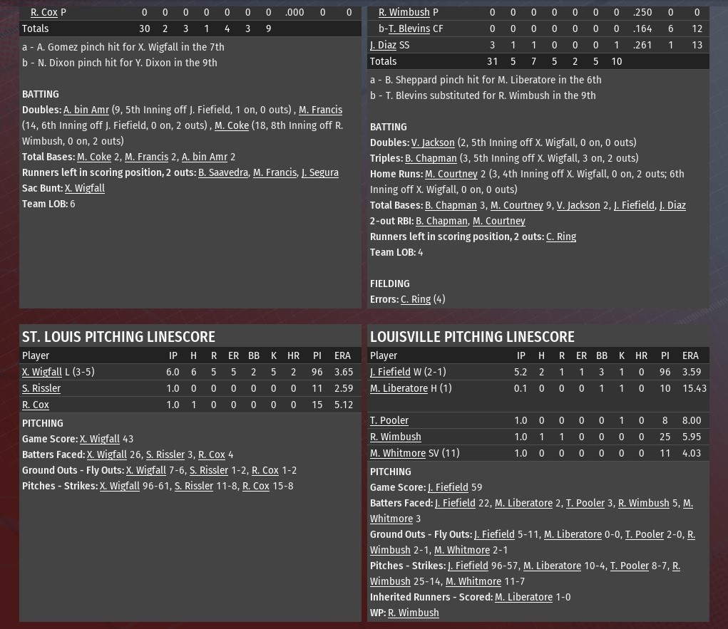 Milwaukee cranked five home runs -- including a pair of solo homers by Petr Crowe-Armstrong -- as the Crushers defeated St. Louis 7-3 at Busch Stadium (2006). Solo homers in the top of the second (by Bret Baty) and third innings (by Crowe-Armstrong) helped stake Milwaukee to a 2-1 lead. The River Walkers, however, scored a pair of runs in the bottom of the fourth off Milwaukee starter Justin Wrobelski to take a 3-2 lead. Yan C. Dixon tripled to drive in a run. He scored on a sacrifice fly by Nathaniel Dixon. Milwaukee waited until the eighth to take the lead on a two-run homer by Tyler Carter off Walkers reliever Ron Cox. Cox then surrendered a two-run homer to Crow-Armstrong in the ninth to make it 6-3. Bobby Westerman replaced Cox, only to give up a solo homer to Corey Flowe, which capped the scoring. Wrobelski went 5.1 innings, allowing three runs on five hits. He struck out six and walked one. Bobby Dellinger finished the sixth for the Crushers. After that, Caleb Walker, Dave Araya and Ed Sutherland, all three scoreless innings to complete the win. Araya (3-2) earned the victory. |