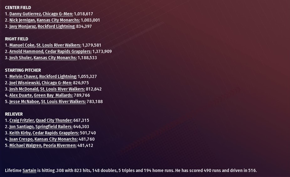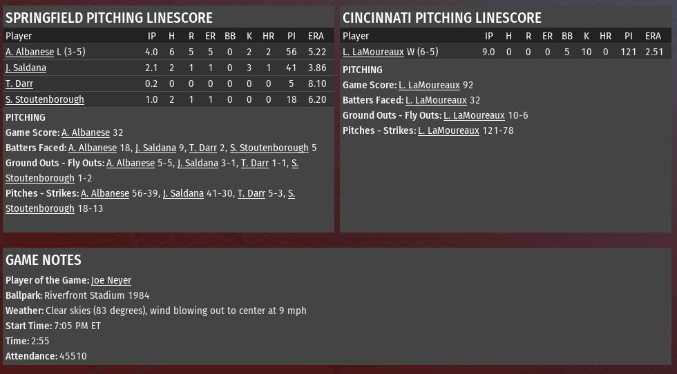 St. Louis pounded out 11 runs on 11 hits -- highlighted by a four-run bottom of the second inning which put it control -- as the River Walkers routed Springfield 11-3 at Busch Stadium (2006). The Walkers put seven runs on the board before the Railers finally answered with two in the top of the sixth to make it 7-2. Rookie Mark Herman started the scoring when he led off the bottom of the second with a single off Springfield starter Ewdy Alex. A walk to Jackson Miller moved Herman to second. He scored when Yan C. Dixon reached on an error by Railers first baseman Joseph Hughes. Jose Segura then made it 3-0 with a triple. Segura scored the inning's final run, scoring on a Abdul-Nasser bin Amr ground out. After adding a single run in the fourth, the Walkers got back-to-back homers from Manuel Coke and Mark Herman, off reliever Mike Fowler, to open the fifth inning as their lead reached 7-0. A homer from Billy Salas off Walkers starter Edward Kunselman accounted for the two Railers runs in the sixth. Chris Duncan hit the third St. Louis homer of the game in the sixth, a solo shot off Fowler. The Walkers final three runs came an inning later. Pinch-hitter Alfredo Gomez drove in the first run with a single. Bob Saavedra earned a pair of RBIs with a double. Kunselman (5-0) went seven innings, allowing two runs on six hits. He struck out two, and didn't issue a walk. Ron Cox pitched the final two innings, giving up a meaningless run in the eighth. Note: St. Louis All-Star right fielder Manuel Coke had to leave the game after being hit by a Fowler pitch in the sixth. Fowler had just allowed a homer to Duncan, the previous batter. A diagnosis on the injury was unavailable. Last edited by rink23; 11-05-2021 at 04:18 AM. |