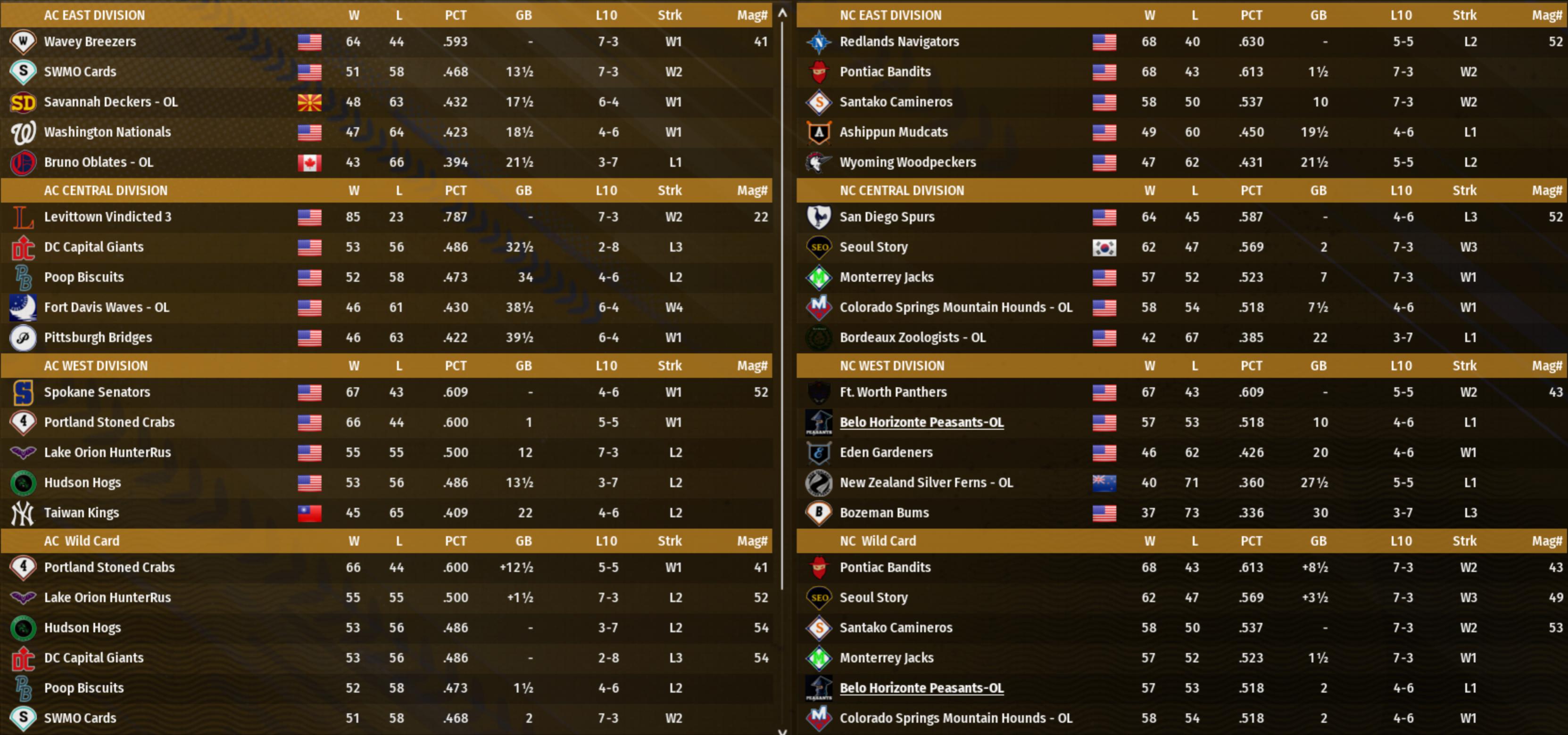 Bushwood's most recent series was an 0-3 sweep by North Bay, which has dramatically shifted the balance of power. LA have 3 games vs Mevagissey, Bushwood have 3 @ Greenland. A series win for either will eliminate the rest of the league. In the unlikely event that both of the leaders flame out, Claptown have 6 games, Coney Island have 8, North Bay 7, and Waffletown 9. I think they all have at least a sliver of a chance, but North Bay probably have about a one in a million shot!
