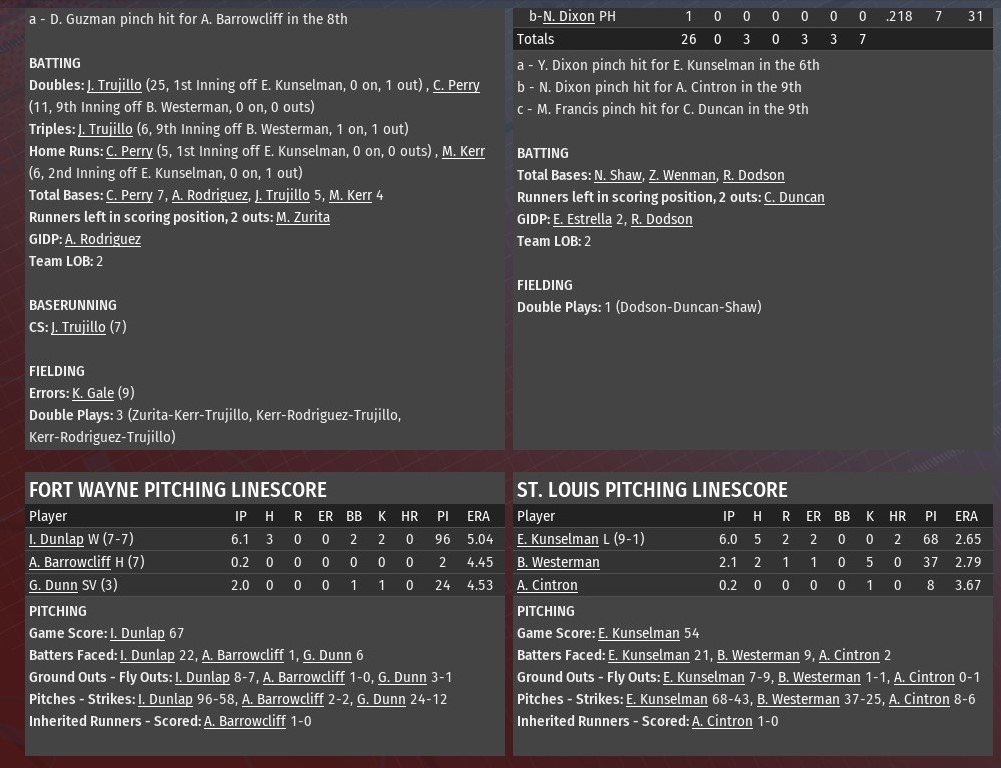 Isaiah Dunlap took a shutout into the seventh inning and a pair of relievers kept it going, as Fort Wayne defeated St. Louis 3-0 at Busch Stadium (2006). The win was the third in a row for the Mad Men, to complete the four-game series. Dunlap (7-7) allowed just three singles in his 6.1 innings. He struck out two and walked two. Anthony Barrowcliff finished off the seventh for the Mad Men. Glenn Dunn worked two scoreless innings to earn his third save. Conrad Perry led off the game with a solo home run and Matt Kerr hit one in the second, both off River Walkers starting pitcher Edward Kunselman, to stake the Mad Men to a 2-0 lead. Kunselman (9-0) took his first loss of the season. Perry led off the ninth for Fort Wayne with a double off Bobby Westerman. He scored on a Jairo Trujillo triple, making it 3-0. |