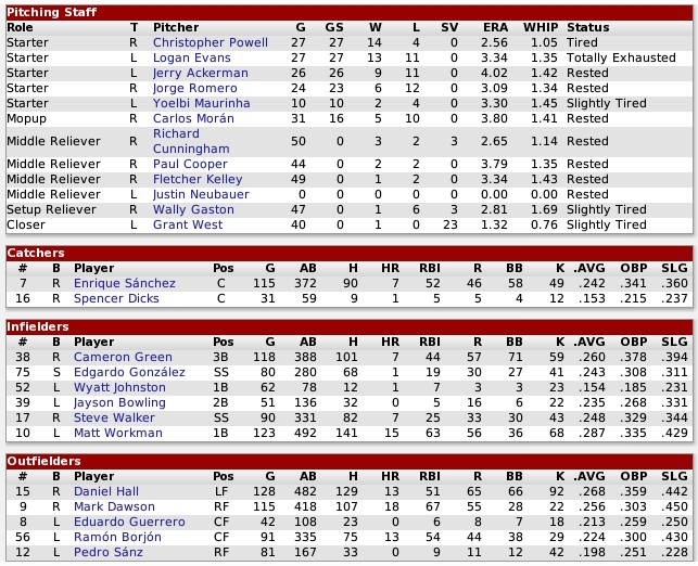 We brought in 44-yr old Dominican Angel Vega later that month as interim replacement, with looking out to sign a battle hardened veteran scout in the off season. The good news: Ramón Borjón and Edgardo Gonzalez were activated from the DL before the Cincinnati series. Now we had some remote chance for some mediocre offense again. Fernando Perez and Angel Costa were removed from the roster, both had been hitting below .180 and had generally not been helpful. Raccoons (51-66) vs. Cyclones (52-65) This looked like evenly matched teams, but wasn’t. The Raccoons had come from playing .600 ball to .430-something. The Cyclones were rallying from .350 in May. But the Raccoons had some frustration in them and took it out on the Cyclones in game 1 with six runs in the fourth and fifth innings. Powell pitched seven innings of shutout ball, but I pulled him there. His pitch count was already advanced and I didn’t want to push him too much. Bill Craig came in and quickly blew the shutout. The Raccoons won 6-1, and Powell had win #13 this season, one shy of tying the Raccoons record. More good news before game 2: Mark Dawson was cleared by the team trainer to play again. This benched Pedro Sánz, whose de-velopment has saddened me the most. He can’t even bat .200 anymore (as does Johnston, but that was a gamble in the first place). Now the remaining big bats (Workman, Hall, Dawson, Borjón) were united again in 2-3-4-5 in the lineup. Nixon was out for the season of course. Now, if Logan Evans could just get his pitching together. His control had never been there at any point during the season. He was actively chasing the 108 walks he surrendered in 1980, when he lost 14 games with a 4.40 ERA and 1.59 WHIP. Yet here, an infield single did him in to start game 2. The Cyclones led 1-0 after the top 1st, but Cam Green led off with a solo bomb for the Raccoons to tie the game. Green tripled in his next AB with two down in the third, followed by Workman drilling a ball inches past the inside of the left field foul pole. 3-1 Raccoons. Mark Dawson showed that he was back with a 3-run homer (#17) in the eighth. And how was Evans? His pitches were too much to cope for anybody: the Cyclones batters, the strike zone, and even poor Enrique Sanchez. But he went 8.1 innings, with 5 H, 2 ER, 3 BB, 9 K! (Nine K’s are *a lot* in the ABL!) The bullpen had some issues to end the game and Grant West had to come in to get the final out (with a K) in the 6-3 victory. Green 3-4, HR, RBI; Workman 3-4, HR, 2 RBI; This marked the first series win for the Raccoons in almost one and a half months!! How about a sweep? The Raccoons were gently helped to a 4-spot in the bottom 2nd with a walked in run and a run scoring wild pitch by Jesse Thompson. Now they just had to cope with Jerry Ackerman’s own pitching. Ackerman’s issues came from his inability to strike people out. He went to 2-strike counts on eight consecutive batters from the third through the fifth innings and whiffed only one. He only yielded one hit, either, but he had about 1.25 BB on every K and that was a major issue. The Raccoons lived on their early 4-0 lead. Ackerman surrendered a run in the sixth, his last, inning, Cooper allowed one as well and West had a bad top 9th, but still had something to live off. He allowed one run but saved a 5-3 win. Horrifying stat of the day: this is the Raccoons FIRST 3-game series sweep of the season!! Horrifying stat of the day #2: this is the Raccoons FIRST 3-game series sweep in interleague play EVER!!! They still didn’t leave last place, since the Crusaders swept their opponents as well. Raccoons (54-66) @ Indians (61-60) Now it was about keeping momentum, right? Unfortunately the Indians had won eight in a row, and they scored a run against Romero in the first right away. Matt Workman’s 3-run blast made it 3-1 Raccoons in the third, and with a now solid Romero on the mound, the Raccoons looked quite comfortable, and moved the game out of reach in the eighth with four runs, including a 2-run homer by Steve Walker. We won 7-1. Romero 7.0 IP, 4 H, 1 ER, 0 BB, 0 K; Hall 2-4, BB, 2B; Dawson 2-4, BB, RBI; Walker 3-4, HR, 2 RBI; Gonzalez 2-4; Sánz (PH) 1-1, RBI; This moved the Raccoons out of last place, since the Crusaders lost 5-1 at home to Vancouver. It also posed the question, whether Jorge Romero deserved another one year of contract. Yet certainly he didn’t deserve just shy of 400 grand again. At the same time the ABL considered him a type A free agent at the moment. Game 2 brought unknown territory as far as the Indians pitcher was concerned. Franklin Palmer was 1-0 with a 1.13 ERA in two starts with the Indians, since being acquired from the Falcons. That was one of the less telling stats, it turned out, since the Raccoons scored twice in the top 1st, and added for a 4-0 lead after three. Palmer’s at first glance great record was rectified, while Yoelbi Maurinha pitched a great game. Before the game he had gotten barely 4 K/9, but grabbed his second win with a 7.2 IP, 5 H, 0 R, 0 BB, 7 K line. Dawson hit a 2-run shot off Josh Bridges in the seventh for long ball #18. The Raccoons shut out the Indians in a 7-0 win. Green 2-3, 2 BB, RBI; Hall 2-4, BB, 2B, 2 RBI; Dawson 2-5, HR, 3 RBI; Before Indians starter Jose Salgado recorded an out, the Raccoons led 3-0. Green singled, Workman walked, Hall hit a ball all the way to Ohio. But Salgado settled in from there, while Powell fell to his old enemy, the home run, in the fourth, when he gave up a 2-piece to Arturo Garcia, and the Indians tied it in the fifth and went ahead in the sixth. The Raccoons did not find back into the game and were held to five hits and struck out eight times in the end and lost 4-3, ending a 5-game winning streak. Romero pitched all the way for his fourth loss of the season. Raccoons (56-67) vs. Titans (59-66) Logan Evans’ control problems continued to start the series against Boston. He walked five, but the damage remained limited w