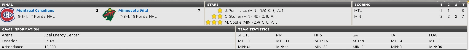 TBY - 2 CAR - 3 LW Nathan Gerbe (6.5b/7.0b) (1G/0A), LW Jiri Tlusty (7.0b/7.5b) (1G/1A), and RW Alexander Semin (8.0b) (1G/0A) was all the goals the Hurricanes could get by Lightning G Ben Bishop (7.5a/8.0) on 42 shots, but G Cam Ward (8.0d) stopped everyone but Steven Stamkos (10.0a/10.5a) (2G/0A) from scoring on 35 shots for his eighth win of the season. MTL - 3 MIN - 7 The Wild certainly lived up to their moniker tonight at home vs. the Canadiens! Wild D Clayton Stoner (6.5c) (0G/1A) was happy to oblige Montreal's D PK Subban (9.0b) (1G/1A) who tried to spark his team by picking a fight near the end of the first period. Sadly for Subban, like the score the fight went to the Wild. RW Jason Pominville (8.0c) (3G/1A) then answered a Montreal goal making it 3 - 2 by reeling of three consecutive goals over the second and third periods for his hat trick, effectively putting the game out of reach. Canadiens C David Desharnais (7.0d/7.5d) (1G/0A) and Wild C Mikael Grandlund (7.5a/8.0a) (1G/0A) traded garbage time goals to finish out the game and the score. In other NHL news; FLA - GM Bonehead Moore receives a unannounced visit from his owner and quickly updates him of team happenings and of potential trade negotiations with the San Jose Sharks and New York Islanders. Mr Viner nods and then hands Bonehead a suitably impressive report on the financial numbers and state of the team Bonehead wonders from who and how did the owner get all this information, without him knowing first? The meeting breaks up and Bonehead invites the owner to head down to the ice rink with him to see game practice for tonight's tilt vs. the Capitals. |