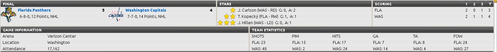 Coach Ramsay sets up the dry erase board and announces the changes in tonight's lineup 3rd Line RW Butler will sit to give LW/RW Joey Crabb a start in the NHL and Crabbs better defensive numbers will probably help. Additionally the 4rd line will get 10 mins per period and the additional 5 mins will go to the 4th line to help cover the top 6 forwards of the Capitals... Coach McCabe announces D Matt Gilroy will play tonight instead of D Robak to give Robak a rest and keep Gilroy's head in the game. The first period begins and after the first three minutes, the coaches moves look like pure genius... but after one period is played were tied at two and the shot advantage is 13 - 6 Washington. Bonehead is unhappy with Gudbransons stupid check to the back of Ovechkins head and the Panthers will start the second period with a major penalty and 4:58 to kill off the clock. The Panthers start the second period successfully killing off the major and its the first line on the ice when the go ahead goal is scored by the Capitals. The Panthers PK players are gassed, and Bonehead and Coach Ramsay are trying to shuffle the lines to keep the oppositions top six from mismatching our lines and getting the PK rested. Fortunately only one more penalty is called and the Panthers escape the funhouse while Washington racks up 20 shots on goal in the period for a 33 - 18 total! This team surprises Bonehead as even as they file in, they are talking about how lucky the Capitals are that the Panthers aren't scoring... Bonehead stresses the shot totals are going to catch up to the Panthers an they need to be more disciplined in their own zone with the puck. The third period begins and Gudbranson is whistled again for boarding this time, and Bonehead glares down at Coach McCabe who nods back at him. Finally a break! the Capitals are called for tripping and the one goal lead can be neutralized by a PP goal... But a turnover by Capt Campbell sends a two on one SH attempt and C Eric Fehr buries it behind Markstrom for a two goal lead... An Absurd 4 seconds later the PP clicks and D Tom Gilbert cranks a slaphot that G Neuvirth never saw restores the one goal deficit and just as it seems the Panthers are getting untracked and generating some shots, D Gudbranson gets caught blatantly hooking a Capital player and back to the sin bin for his fourth trip... Fortunately the PK does its job again leaving the Capitals stumped with an 0 - 6 night on the PP. The score stays the same until the final buzzer and the shot totals are an embarrassing 48 - 23. The Panthers doubled up Washington on takeaways (8-4) and halved the giveaways (7-14) compared to the opponents, probably salvaging the score tonight. The fourth line played exceptionally well and logged over 22 minutes each with Goc and Kopecky having over 7:00 of PK time alone! The first line (-2 +/-) were only on the ice for approx 9:00 mins and the first defensive pairing (-3+/-) was credited with a PP goal but made too many defensive mistakes tonight. The post game press conference is short as Bonehead takes charge and admits faults and notes the positives (opposition's top six only accounted for 2 goals, 6 - 6 on PK results - again) Bone head promises a more complete analysis of the game and will hold a press conference tomorrow outlining some changes he's making to the team. The team charter is waiting at the airport and for once Bonehead thinks its taking forever to get all the equipment loaded and he tells the players to stop fooling around and be ready for the bus to leave or find their own way home...