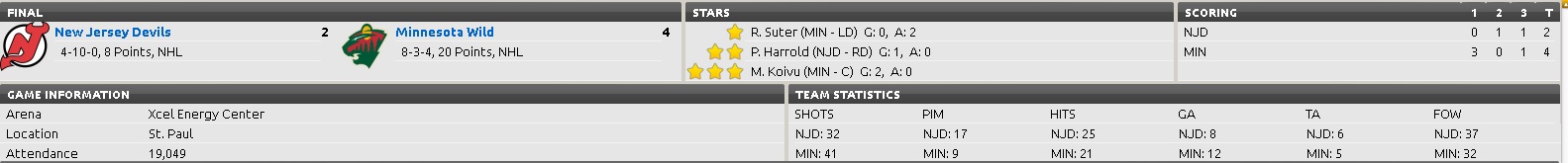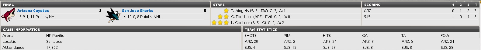 Trying a new format... WAS - 5 PHI - 4 The Capitals Mikhail Grabovski (7.5c) finally found the back of the net with just :20 sec left for his first goal of the season to give the visiting Capitals a needed win, D Luke Schenn (7.0a/7.5a) (0G/3A) was +2 on the evening in a otherwise poor performance by the Flyers "D". NYI - 3 OTT -4 The Senators ran out to a 2 - 0 lead after the first period only to see a furious third period comeback effort from the Islanders fall on a late C Jason Spezza (8.0d) ES goal after tying it up. Sens C Zach Smith (6.5c/7.0c) (2G/1A) had a three point night and First Star honors for his efforts. COL -0 DAL - 6 Stars coach Lindy Ruff told players before the game to forget October's record and just play "like they know they can". Those words certainly were heard by the locker room! Stars G Dan Ellis (6.5a) turned away all 30 Av's attempts for the shutout and First Star honors.The Stars dominated the shots in the game with 48, and Eric Cole had a natural hat trick in the second period to blow an otherwise close game open. In the post-game press conference the Av's coach pointed out that seven of nine penalties called went the Stars way and two of Cole's goals came on resulting PP's. No word from league officials if the Av's coach will be fined for his veiled comments about the officiating tonight. CLB - 2 PIT - 1 A close checking evenly played game was enjoyed tonight by fans at the Consol Energy Center in Pittsburgh, and the outcome was all that they wanted changed. The Blue Jacket's 24 y/o AHL call-up G Jeremy Smith was spectacular in his first NHL game, allowing only one goal on 28 shots and getting third star honors. RW Marian Gaborik's (8.5d) third period score with 4:56 left proved to be the game winner. DET - 2 CGY - 6 The Flames are proving themselves a real force in the Western Conference as they dismantled and demoralized the Red Wings tonight. The Flames second defensive pairing of Kris Russell (6.5c/7.5c) (0G/1A) and Chris Butler (7.0d) (0G/1A) were each a +3 with a point, and LW Jiri Hudler (8.0b) (2G/0A) scored two ES goals in the third period to help ice the game for the Flames. |