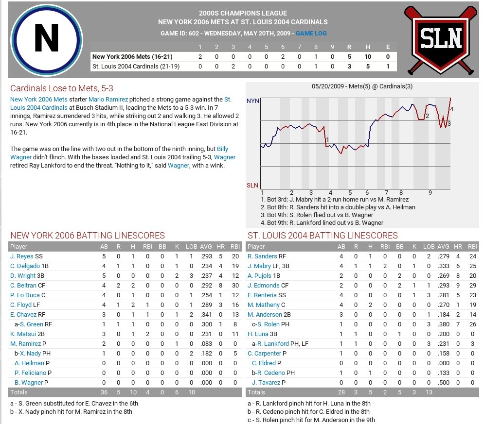Rec/Std: 21-19, 2nd (T/w. Cincinnati), 3 GB Pittsburgh W: Ramirez 2-3, 7.04. L: Carpenter 4-4, 4.42. Sv: Wagner 9, 2.50. HR: Mabry 6. Player of the game: Mets starting pitcher Mario Ramirez went seven innings, allowing two runs on three hits. He struck out two and walked three. Note: The loss snapped a six-game winning streak for the Cardinals. Last edited by rink23; 02-16-2018 at 04:06 AM. |