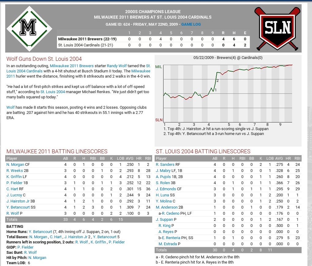 Rec/Std: 21-21,4th, 4 GB Pittsburgh W: Wolf 4-2, 2.77. L: Suppan 4-3, 4.45. HR: Betancourt 7. Player of the game: Brewers starter Randy Wolf went the distance in the shutout allowing just four hits. He struck out eight and walked two. |