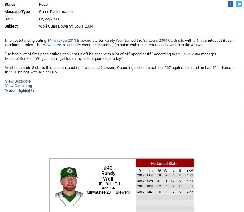 Rec/Std: 21-22, 4th, 5 GB Pittsburgh W: Gallardo 4-2, 4.75. L: Marquis 4-3, 5.57. HR: Hart 16: Player of the game: The Brewers' Corey Hart was 2 for 4 with a home run, a triple, two runs scored and five RBI. (computer). Brewers starting pitcher Yovani Gallardo pitched seven innings, allowing two runs on two hits. He struck out eight and walked two. |