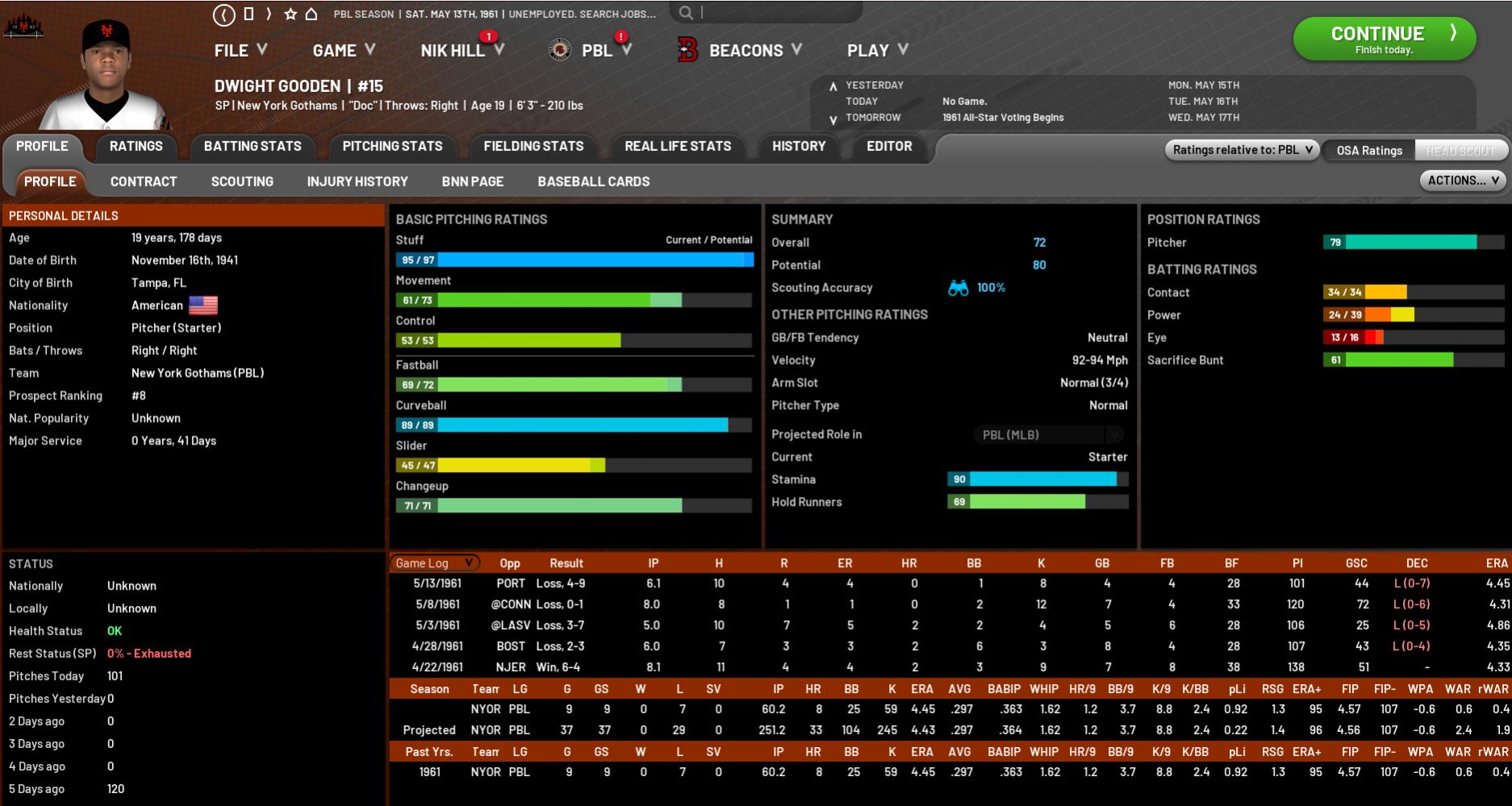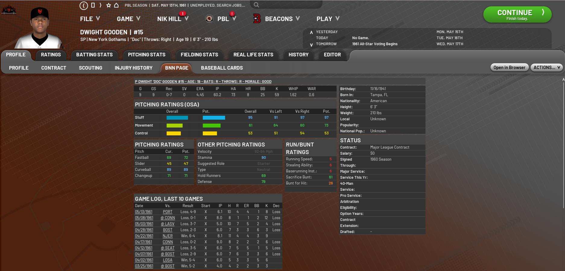 Well I know we are only 6 weeks into the inaugural PBL season and what we are all convinced will turn out to be a long and storied career, but 9 starts in and the question begs: What exactly is wrong with Dwight Gooden? The 19-year-old native of Tampa, FL came into this league with just about the biggest wraps imaginable on him. All the talk revolved around the monumental number of games his Gothams would win with the Gooden-Walter Johnson-Jacob deGrom 1-2-3 punch at the top of its rotation. That, of course, is not what has happened so far. While deGrom (4-1 / 2.84 / 74 FIP-) has started brilliantly and Johnson (4-3 / 4.28) held his own, Gooden is languishing at a horrid 0-7 with an ERA of nearly four-and-a-half. So, what gives? Let’s start by looking at those 9 starts individually: