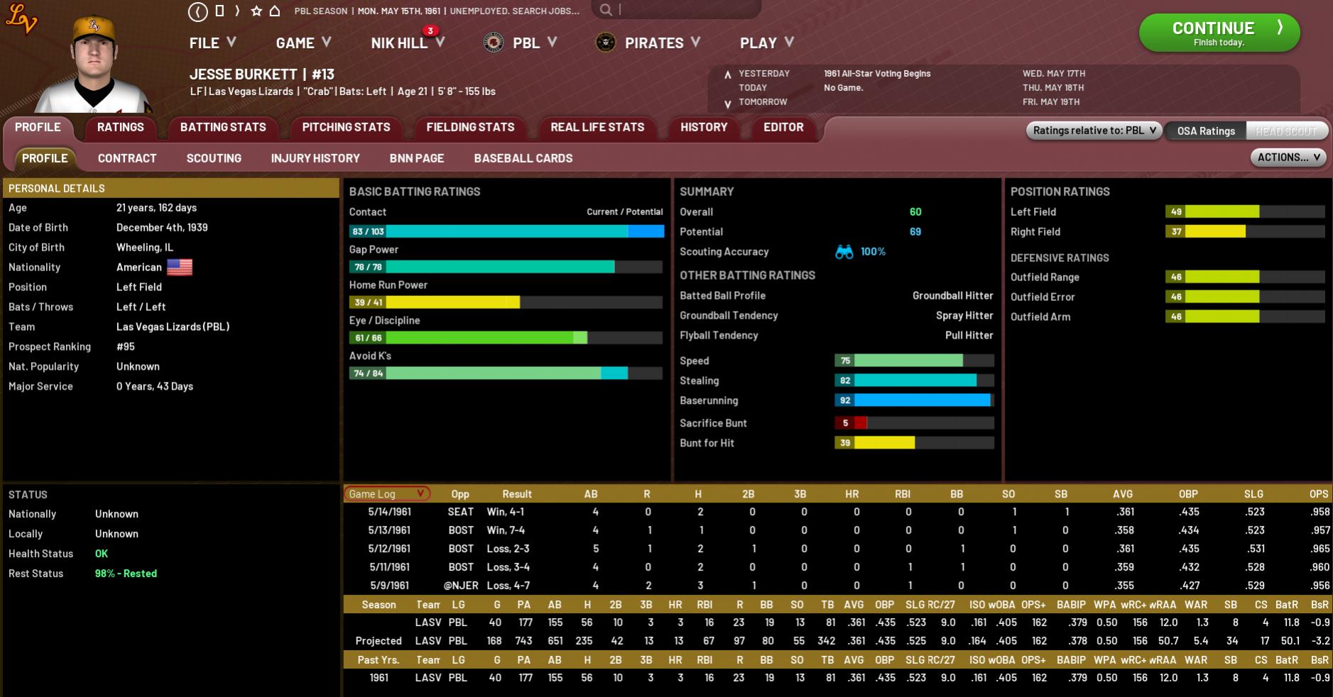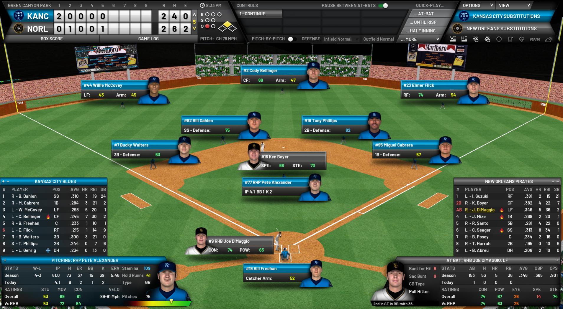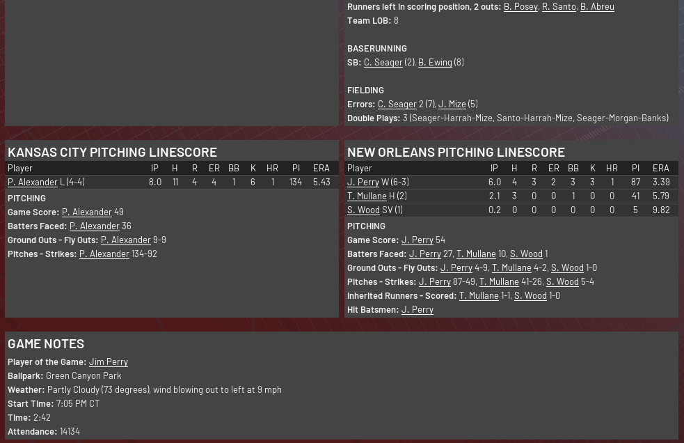 Green Canyon Park – New Orleans, LA; 8.05 pm NORL: Jim Perry (5-3, 3.43) KANC: Pete Alexander (4-3, 5.56) Hello and welcome to another Game of the Week telecast, I’m Nik Hill. Tonight we are at Green Canyon Park in downtown New Orleans to watch the Pirates battle the Kansas City Blues, both of whom play in the PBL’s South Division. A slightly overcast night here in the Big Easy, with just a hint of breeze blowing out to left. The Pirates have been heading in the wrong direction of late with a 4-8 record this month that has left them last in the division, and they’ll be extra keen not to lose further ground to the third-placed Blues, currently four games to the good of them. Jim Perry is starting for the home side tonight, and he has begun the season solidly with five wins and three losses, with an ERA in the mid-threes. He’s up against Pete Alexander, who I’m sure will be looking for an improvement on his performance to date, with opposition hitters lighting him up a bit with a .289 average to this point. With the lively bats in both lineups and both bullpens having been problematic so far, this might be a bit of a runfest tonight if the starters get into strife, as was the case in the middle game of the first series between these two teams in mid-April, when the Blues torched them for 20 runs. Oddly, that came between two low-scoring wins for the Pirates. But their relievers have been on the nose to this point, with their 8+ ERA easily the worst in the SEL, and they’ll need to tighten that right up if they want to be competitive in the long run. To talk about this and more with the man whose job it is to fix these sorts of problems, here’s Juliana Scott. Jules, I understand you and your guest go way back. Juliana Scott: Thanks Nik, I have Pirates Manager Jim Leyland with me and yes, this is the man I did my first live interview with back a few years ago in Pittsburgh. In fact, he’s known me all of my life, haven’t you Uncle Jim? Jim Leyland: Well, I missed the first few hours JJ, but from then on we’ve been pretty good mates, so go easy on me or I’ll be having words with your Mama (laughs). JS: Oh, anything but that, please (laughs). An up-and-down start to the year by your boys, and May has been a tough month up to now – what are your thoughts on the team’s performance? JL: Yeah there are a few key areas we just haven’t been up to scratch in and they’re not hard to find. Our bullpen has had a real tough time of it, starters have been inconsistent, bottom third of the lineup too quiet. We know where we have to be better, but as always it’s easier said than done. We just have to keep working away and trust in our guys to come around. JS: That said, there have also been some excellent signs for your group. Seager has been giving pitchers fits so far, Suzuki and Boyer were like two lightning bolts in April, DiMaggio looks like an elite-level player, same with Mize. Whitey Ford has been fantastic. That must give you plenty of encouragement despite the current standings. JL: Oh, undoubtedly. Plus there’s the younger guys like Jackson and Morgan who we feel will end up being superstars in this league, so we’re confident we have the right bunch of ballplayers to bring sustained success to the club. If we have to ride out a few early bumps like we are at the moment, then so be it. As long as we’re always heading in the right direction. JS: You come into this series off a pretty ugly loss to the Firebirds last night, how’s the mood in the group? JL: It’s probably the game before that hurts more. We’d got home in a tight one on Thursday and were feeling pretty good about things, but then one ill-timed error on Friday cost us 5 unearned runs and we took a tough beat. I think last night was more a reflection of that disappointment. We just hung our heads and didn’t show up to play. That’s the sort of thing that happens with young ballplayers, and I made sure to point out to them after the game that this isn’t how we want to be going about things. So I’m looking for a much improved showing tonight and in the rest of this series. JS: Tonight’s starter Jim Perry has been pretty good for you so far, what are you looking for from him tonight? JL: Yeah, we really like what we saw from Jimbo against the Grays and a couple starts before that at Carolina was maybe his best performance of all. But then in-between those two he got shelled and was gone by the third. So, once again, it’s all about working towards consistency in your play. The bad loss against Virginia he was overthrowing big-time, trying to fan every batter he faced. That was a big lesson learned for him. He just doesn’t have the stuff to pitch like that. I doubt he’ll make the same mistake again. He’s finding out what works for him out on the mound and just needs to stick with his strengths. And we need him to go as deep as he can because of our problems in the pen right now, so he must be as economical with his pitching as he can to give that every chance of happening. JS: And just before I let you go, I have to ask about Ichiro. Have you seen anything like this media coverage from his homeland? JL: Nothing remotely like it. I don’t know how he handles it, let alone always with a smile on his face like he does. I think it speaks volumes for him as a person and Japanese culture on the whole that all the madness is conducted in such an orderly and polite manner, with everyone involved so respectful of one another. We should take a leaf from their book in this country. And then he comes out and does what he has on the field. It’s mind-blowing, utterly mind-blowing. JS: A great story indeed and can't wait to see how it plays out from here. OK, thank you so much for your time and best of luck tonight and for the season ahead. Guess I’ll see you next week for Pop’s birthday. JL: That you will my love, wouldn’t miss it for the world. I know what’s good for me (laughs). JS: G