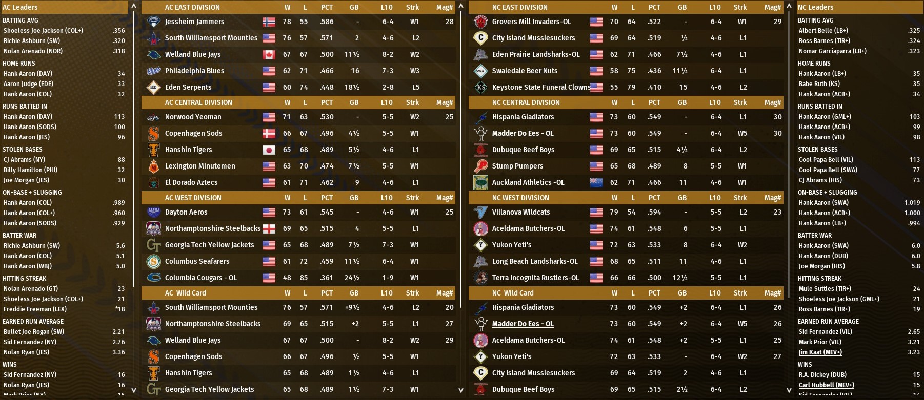In OL play, it came down to the final 4 game series between Waffletown and Shinbone to decide the crown. The Syrups took game 1 (6-4), and then Shinbone grabbed wins in game 2 (7-5) and game 3 (6-5... Shinbone scored 5 runs in the top of the 9th, and Waffletown picked up 4 runs in the bottom of the 9th to come up just short). Game 4 would be the deciding game, with the winner claiming the OL crown; and it ended up being a thriller of a pitching duel. Shinbone's Fred Hutchinson pitched a complete game, going the full 9 innings, giving up just 4 hits and 1 run with 1 walk and 6 strikeouts. Waffletown's Bullet Joe Rogan was up to the task, tossing his own complete game as he went the full 9 innings as well, giving up just 3 hits with 1 walk and 9 strikeouts. The only difference in the game... a walk-off solo home run by Syrup's first baseman Willie McCovey to clinch the 1-0 victory and the OL crown for Waffletown. Overall, there was more drama as Shinbone and Claptown finished with identicl 91-71 records to share the division lead, so they would need game 163 to decide who got the division crown and who picked up wild card spot number 2. Shinbone would take a 3-0 lead (scoring runs in the 4th, 6th and 7th); but Claptown would storm back with 3 runs in the top of the 8th to tie it up. The game went to extras, where Shinbone emerged victorious with a run in the bottom of the 10th for a 4-3 win. For the playoffs: in the AC, Waxhaw nabs a bye for the first round, while Los Angeles will play in the wild card round. In the NC, Waffletown gets a first round bye, while in the wild card round, Greenland will play Claptown; and Shinbone will try to win to face the Syrups in the LDS. North Bay will head back to Silver next season |