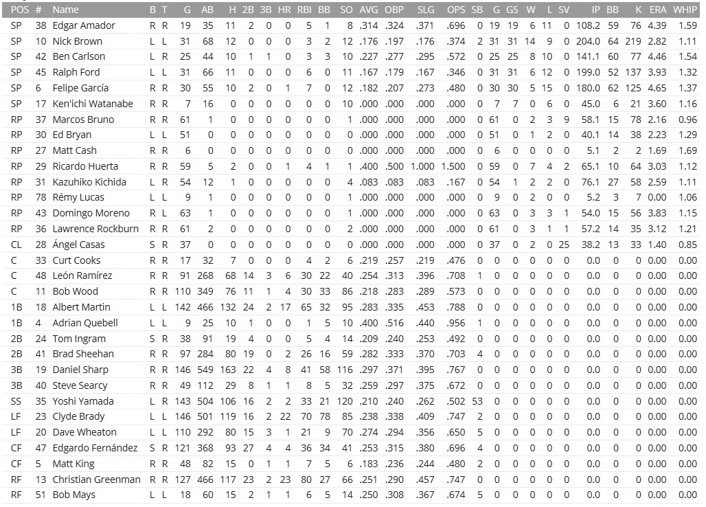The third-most runs were scored both offensively and defensively when the Knights were involved. Their rotation ERA was 4.47 (10th), bad enough, but they also had a 4.17 ERA bullpen, which was soundly the first in the league. Yet, they still won four of six from us this season. Projected matchups: Edgar Amador (6-11, 4.39 ERA) vs. Ed Wallace (2-1, 4.50 ERA) Ralph Ford (6-12, 3.93 ERA) vs. Jong-suk Lee (8-18, 5.09 ERA) Felipe Garcia (5-15, 4.65 ERA) vs. Larry Cutts (17-6, 3.40 ERA) Game 1 ATL: RF R. Lopez – CF Ware – LF J. Morales – C J. Lopez – SS Luján – 2B J. Miller – 1B J. Gutierrez – 3B Pena – P E. Wallace POR: 3B Sharp – 2B Sheehan – LF Brady – CF Greenman – 1B Quebell – RF Mays – SS Yamada – C Wood – P Amador The Knights had left-handed bats sitting in the #2 and #3 holes, and those gave Amador a heck of trouble. He only once retired any of them, but the right-handers on the other hand were axed down with great furor, and Ware and Morales were stranded both in the first and third innings. The Coons left on a pair in the second, then had Ed Wallace issue walks to Brady, Greenman, AND Quebell to start the bottom 4th. Mays romped a pitch up the middle for an RBI single, and Yamada hit a sac fly before Wood singled to reload the bases, and then the Fat Cat drew a Fat Walk – and was all exhausted arriving at first base. That bases-loaded walk to the pitcher made it 3-0, Sharp popped out to second, but Sheehan would score a pair with a 2-out single to give us a 5-0 lead. The Knights got on the board the next inning. Amador foolishly drilled Wallace with a pitch, and Ware hit a 2-out single, moving the pitcher to third base. Wood had a ball scoot through his legs to bring in the run before Jose Morales could hack himself out – the first left-hander retired by Amador. Bob Mays would drive in another run in the seventh inning, while Jorge Lopez managed to take Ed Bryan deep in the top 8th. Bryan had already retired Ware and Morales, and we thought, well he can pitch to one right-hander every fortnight – no. Just no. Cash took over, but put a pair on in the top 9th. With Casas not showing much in the way of strikeouts and Bruno having an obscene rate of about 12 K/9, Marcos came out, and struck out Rodrigo Lopez to end the game and notch a save. 6-2 Coons! Quebell 2-3, BB; Mays 3-4, 2 RBI; Amador 7.0 IP, 6 H, 1 R, 0 ER, 3 BB, 4 K, W (7-11); Danny Sharp extended a 10-game hitting streak at the last possible moment, with a 2-out single in the bottom 8th. Game 2 ATL: LF R. Lopez – SS Luján – CF J. Morales – RF J. Garcia – 1B J. Gutierrez – 2B J. Miller – C Defrese – C Pena – P J.S. Lee POR: 3B Sharp – RF Mays – LF Brady – CF Greenman – 1B Martin – SS Yamada – 2B Ingram – C Cooks – P Ford The Knights drew three walks, but no hits and no runs from Ford in the first three innings before Jose Morales fired a home run to lead off the fourth, giving them a 1-0 lead. They continued to load the bases, including the fourth walk on the day, but didn’t score when Ford struck out Lee to end the inning. While it was going like gum for the Raccoons against an 18-game loser, Juan Gutierrez homered to start the top 6th, 2-0, but at least Bob Mays finally made contact in the bottom of the inning and drilled a solo home run himself to get back to 2-1. By then Ford was already out of the game, leaving after five and two thirds with two men on and the right-handed leadoff man Rodrigo Lopez up, merely batting .310. Lee was hit for the next inning, but not that it helped the Raccoons much. The top 9th almost saw the score explode after Rémy Lucas came in with two out and nobody on, got a very good grounder to Tom Ingram from Jose Morales, and Ingram made another one of those colossal throwing errors. Lucas walked the next batter, and Bruno came in to get the final out. We faced Manuel Reyes in the bottom 9th, still down 2-1, but his first pitch was hit for a double up the leftfield line by Al Martin. Yamada lined to left, but Rodrigo Lopez caught it, and after that Wheaton hit for the dirt bag Ingram. Both him and Sheehan would drive balls to deep center, but none of them got them past Morales, and the Raccoons took one of those sour losses that still have you cry on Sunday. 2-1 Knights. Martin 2-3, BB, 2B; Huerta 1.1 IP, 0 H, 0 R, 0 BB, 1 K; Time to erase Tom Ingram from any depth chart we have. As if batting .202 wasn’t enough, he was actively sabotaging his team with a .948 fielding percentage. But I’m glad we could help out You-suck Lee, or whatever that guy was called. Daniel Sharp has a 12-game hitting streak and is making a bid for a .300 season very late here. He hit .301 in ’01 and .304 in ’04. So he might end up at .305? Game 3 ATL: LF R. Lopez – 1B Ware – CF J. Morales – RF J. Garcia – C J. Lopez – SS Luján – 2B J. Gutierrez – 3B Pena – P Cutts POR: 1B Sharp – 2B Sheehan – LF Brady – RF Greenman – CF Fernandez – 3B Searcy – SS Yamada – C Wood – P F. Garcia After Morales held onto the Knights’ win last night, he gave the Furballs a headstart in the rubber game, dropping Fernandez’ soft fly for an error to plate Sheehan from third base in the bottom 1st. While the Knights struggled against Garcia – of all people – and capitally failed even when getting a man to third base with one out, like in the fifth inning, Cutts was victimized by ugly 2-out defense by his team. When Garcia hit a ball to the outfield with two out in the bottom 2nd, Rodrigo Lopez took an awkward route, missed it, and it became a double, leading to Sharp’s RBI single and a 2-0 score. Cutts had to whiff the guy to come up with two outs, or bad things would happen. Unfortunately for the Coons, he learned that whiffing part fairly quickly and beat up Fernandez, Wood, and Sheehan in succession in the third through fifth innings. In the sixth Yamada was up with two on and two out, but Yamada by now was automatic out and