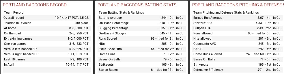 Average offense, average pitching for the Sioux Falls team, resulting in an average record, however, there was a twist to their pitching. The rotation tanked second in ERA over in the Federal League, but their bullpen was being crumpled to a 5.11 ERA, 10th in the FL. They had the best defense in their league, and Whitebread ranked Dan Nordahl as their best player. We haven’t seen the Warriors since 2000! Projected matchups: Kenichi Watanabe (1-4, 4.50 ERA) vs. Manuel Alba (6-1, 3.08 ERA) Nick Brown (4-1, 2.67 ERA) vs. Ramón Huertas (2-3, 6.23 ERA) Edgar Amador (0-4, 5.35 ERA) vs. Dave Crawford (3-4, 2.93 ERA) Tuesday is the earliest Nick Brown can go after serving his suspension, and in case Watanabe lasts at least four innings in his start on Monday, Brownie will have the least innings pitched amongst all our starters until he takes the ball on Tuesday, the result of some odd quirks that have happened already this season, including pinch-hitting for him (to no avail) in the sixth (twice I think), and of course that 20-inning bonanza against the Thunder that derailed our rotation completely in the first week of the season. Interestingly, where he goes now, it will pretty much restore our rotation to the original alignment. Our opposition consists entirely of right-handers. Game 1 SFW: SS Mateo – C Cicalina – CF E. Clark – 1B Bovane – RF C. Ramirez – LF Durán – 3B J. Martinez – 2B Stein – P Alba POR: 3B Sharp – 2B Nomura – LF Brady – 1B Quebell – SS Flores – RF Greenman – C Bowen – CF Trevino – P Watanabe The Coons got a bushel of singles in the bottom 1st, Quebell driving in the first run of the game, his 13th RBI on the season, before Greenman had the bases loaded and hit into a double play – a common theme these days. And weeks. And sadly, years. Old foe Cristo Ramirez would get to Watanabe in the third inning with a 2-out, 2-run single, with the runners having advanced on a wild pitch just prior. Bottom 3rd, Sharp and Nomura reached base for Brady to hit into a two-for-one, but Quebell came up with another single to knot the score at two and to tie for the team lead in RBI with a paltry 14. The knot was solved pretty soon by Jamie Mateo with an RBI single in the top 4th, 3-2 Warriors then, and the Coons had Sharp and Nomura on base AGAIN in the bottom 5th and Brady hit into a double play AGAIN, this time ending the inning. Watanabe looked like he might get through six with only three runs allowed, but stone-old Jim Stein doubled off the wall in right with two out, bringing up Alba, an easy out, who singled up the middle to make it 4-2. Bottom 6th, and finally the line got moving. Quebell led off with a double, and Flores singled. Greenman had a prime chance for a double play, but accidentally hit an RBI single up the middle. When Craig Bowen walked, the bases were loaded and the bullpen got stirring for the Warriors. Too late: Trevino and Mays hit RBI singles and another run scored on Nomura’s groundout, as the Critters took a 6-4 lead with Watanabe in line for the W. Rockburn got two outs before getting a man on in the seventh, upon which Rémy Lucas came out and got the next four outs, handing the ball right to Angel Casas, who cut down the 1-2-3 batters 1-2-3 in the ninth. 6-4 Critters. Sharp 2-4, BB, 2B; Nomura 0-1, 3 BB, RBI; Quebell 3-4, 2B, 2 RBI; Flores 2-4; Mays (PH) 1-2, RBI; Lucas 1.1 IP, 1 H, 0 R, 0 BB, 3 K; Since the Loggers were idle on Monday, we took sole possession of fifth place – YAY!! Game 2 SFW: CF E. Clark – 2B R. Garza – 1B Bovane – LF Graham – C Cicalina – SS Mateo – RF Durán – 3B J. Martinez – P Huertas POR: 3B Sharp – 2B Nomura – 1B Quebell – RF Mays – SS Flores – LF Crespo – CF Trevino – C Wood – P Brown Brownie hadn’t pitched in 10 days, so how would he fare? He struck out Earl Clark to start the game. Then the wheels came off. Ramón Garza singled. Raúl Bovane singled, and Dave Graham walked after a wild pitch. Before the nightmare ended, three runs would go onto the board. Bottom 1st, Sharp and Nomura got on before the music stopped to play there, too, and I went for the cupboard with the secret compartment that contained the liquor. Brown walked Huertas in the second inning, and the pitcher scored on two cheap singles between infielders. The Coons had a 3-run second, in which their ace contributed an RBI double, but it ultimately didn’t help, because that same ace was getting soaked. Urbano Cicalina led off the third with a double and was only nabbed for his eagerness for a triple, being met by Bob Mays’ throw at third base. The Critters trailed 4-3 into the sixth when Mays led off with a single, but was thrown out stealing. That was the last straw for Brown who did not reappear for the seventh, and neither did any brown-clad player potentially capable of wielding a stick. The Raccoons went down silently in this one. 4-3 Warriors. Nomura 3-4, 2 RBI; For two innings, everything that was poked, fell in for the Warriors. Of course, the actual loss is Brownie’s own fault. You never walk the pitcher. You NEVER walk the ****ING pitcher! Apart from that, he struck out seven, and it’s only 493 to go to the next milestone: 1,500 K. Hopefully without suspensions, but with some run support. Game 3 SFW: SS Mateo – C Cicalina – CF E. Clark – LF Graham – 1B Bovane – RF C. Ramirez – 3B R. Garza – 2B Stein – P Crawford POR: 3B Sharp – 2B Nomura – LF Brady – 1B Quebell – SS Flores – RF Mays – C Bowen – CF Crespo – P Amador Turns out, this was Edgar Amador’s last major league start in a brown uniform. He sucked colossally, fitting his appearance, and the Warriors sent ten men to the plate in the first inning, plating five runs on five hits and two walks. The second was led off by Urbano Cicalina, who had hit a 2-run homer in the first, put a 3-0 pitch in play and back to the mound, and Amador couldn’t dig it out. He also couldn’t make anything with E