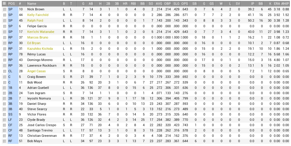 One week in, and our rotation was in shambles after that 20-inning game on Sunday that saw both the Fat Cat and Brownie appear in relief. Neither one was ready to start on either Monday or Tuesday, so we needed a bit of a plan. That plan included a spot starter on Monday, Ralph Ford pitching on Tuesday on short rest, then Brownie on Wednesday (although I don’t like my left-handers back-to-back), Watanabe (on normal rest) on Thursday, and then no Fat Cat until Friday, followed by Fairchild and Ford again.