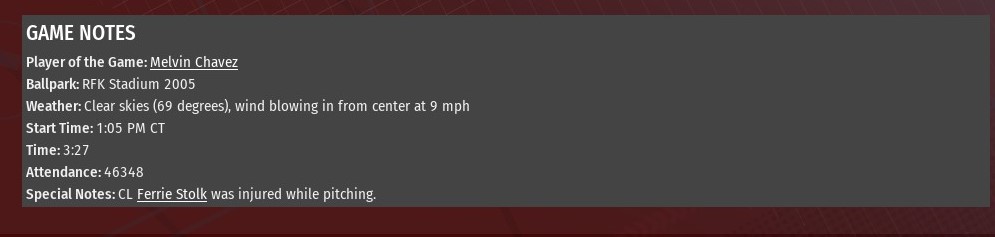 Rockford scored three unearned runs in the bottom of the fourth inning -- and added two more in the fifth off St. Louis starter Josh McDonad -- and the Lightning went on to defeat the River Walkers 5-3 in Game 1 of the National League championship series at RFK Stadium (2005).