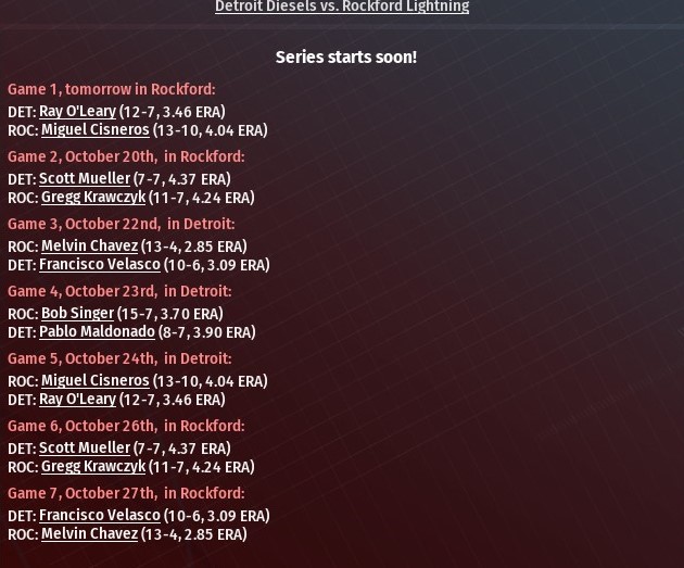 Postseason history Detroit: Division titles 2024, 2026, 2035, 2036. WS titles: 2024, 2026, 2035, 2036. Rockford: Division titles: 2033, 2036. NL titles: 2033, 2036. Last edited by rink23; 01-23-2022 at 06:19 AM. |