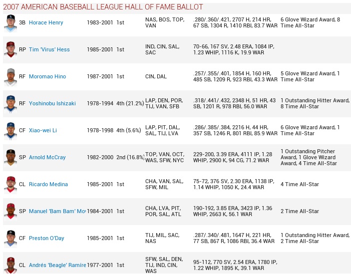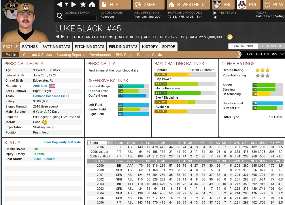 December 14 – The Crusaders spend $3.56M over three years on ex-LAP SP Jesus Bautista (160-169, 3.92 ERA), who lost 15 games each of his four years in L.A. and never posted an ERA better than 4.42; he’s 34. December 15 – Ex-TOP CL Ryosei Kato (53-47, 2.50 ERA, 308 SV) signs a big deal for a 34-year old closer, inking with the Capitals for 3-yr, $6.6M, while the team also adds 1B/3B/LF Cesar Gonzalez (.266, 196 HR, 831 RBI) for 2-yr, $4.56M. December 17 – The Canadiens jump on SS/3B Gary Rice (.263, 63 HR, 397 RBI) for 6-yr, $9.24M. Rice, only 26, was with the Crusaders. December 17 – Former Gold Sock CL Scott Hood (34-34, 2.08 ERA, 265 SV) signs a 3-yr, $1.92M contract with the Crusaders. December 19 – The Raccoons add 33-yr old OF Luke Black (.235, 74 HR, 325 RBI). The former Miner receives a 4-yr, $4M deal. December 20 – The Knights sign ex-OCT Antonio De La Parra (.286, 50 HR, 560 RBI). The 32-year old will get $2.12M over two years. December 21 – Ex-CIN SP Takeru Sato (120-107, 4.20 ERA), who hasn’t been good in years, wins a 2-yr, $2.68M contract from the Blue Sox. December 22 – The Bayhawks pick up ex-SFW 1B/C Urbano Cicalina (.293, 93 HR, 638 RBI) for 2-yr, $4.32M. The aches and pains of his 33-yr old body mean that Cicalina will probably play a lot at first base rather than actually catch. December 24 – The Knights sign ex-POR SP Ralph Ford (69-96, 3.96 ERA) for 3-yr, $4.56M. The Raccoons received the Knights 3rd round pick and a supplemental round pick in the 2007 draft. December 24 – The Thunder shell out $18.72M on a 6-year deal for ex-VAN SP Daniel Dickerson (81-75, 3.33 ERA). Dickerson, 29, has been out with a torn elbow ligament (not Tommy John, though) since July, and is not expected to pitch before the All Star Game. December 24 – Ex-CIN/CHA SP George Allen (52-70, 4.67 ERA) gets a 3-yr, $4.68M deal with the Scorpions. Obivously pissed off that we don’t get a first round pick for Ralph Ford. We could have used it. **** that third round pick… Now, before you hurl stones (or raccoons) at me (don’t, especially the raccoons, they’re too cute to be thrown), the Black deal is actually pretty sane. Only the first two years (all for $1M) of the deal are guaranteed. The last two years are contingent on him appearing in 120 games. If we ever get Bobo Wood going, he can be disposed of easily. Black’s average is not very good, although he does not strike out TOO much (just over 20%). He is going to be 34 in June, but he is still very quick on his feet, resulting in a nice share of extra base hits. He slugged .402 while batting .231 for the Miners last year, with almost 50% of his hits for extra bases. That gives me the idea that he keeps being unlucky with singles, which in turn hints at a possibility that he might not actually drop another 50 points of average in Portland like everybody else uses to do. He plays all three positions very well, his arm kills runners, and he’s totally going to be our starting rightfielder. He played for 2.5 WAR last season, 0.1 less than Clyde Brady, while playing 30 less games. He’s of course the Duke Smack I hinted at. That pitcher I mentioned keeps bitching and moaning and I have dropped him. I have a different starting pitcher in my focus now. He’s from the Fabaceae family. I also struggled badly to get away with just ten choices on the HOF ballot. I tried hard to not have both Raccoons drop off the ballot with less than one percent of the vote, so in the end I didn’t vote for Carlos Asquabal, whom I assumed to get elected anyway, and rather gave one vote to Scott Wade, but didn’t give one to Jason Turner. (Honestly, none of them should even get close to the Hall of Fame…) And boy, didn’t it do Asquabal any good! (Don’t tell him, he’s our new A ball manager) --- HALL OF FAME VOTING RESULTS SFW CL Andres Ramirez – 96.9 – 1st year – INDUCTED NAS 3B Horace Henry – 79.7 – 1st year – INDUCTED ATL RF Michel Root – 73.1 – 2nd year OCT 2B Dave Browne – 57.3 – 2nd year PIT LF Diego Rodriguez – 56.8 – 2nd year ATL SP Carlos Asquabal – 49.3 – 4th year WAS CL Domingo Rivera – 48.5 – 4th year WAS C Gabriel Rivera – 43.6 – 4th year IND CL Jim Durden – 41.4 – 4th year DEN SS Paul Connolly – 34.8 – 3rd year POR SP Scott Wade – 32.6 – 1st year CHA SP Manuel Movonda – 27.8 – 1st year LAP SP David Burke – 25.1 – 4th year TOP SP Arnold McCray – 23.3 – 2nd year LAP RF Yoshinobu Ishizaki – 15.0 – 4th year DAL RF Moromao Hino – 5.7 – 1st year CHA CL Ricardo Medina – 4.8 – 1st year – DROPPED DAL SP Kiyohira Sasaki – 4.8 – 4th year – DROPPED NYC CL Rick Evans – 4.0 – 4th year – DROPPED RIC SP Harry Griggs – 3.1 – 2nd year – DROPPED NAS CF Antonio Rodriguez – 3.1 – 2nd year – DROPPED SFB 3B Roberto Rodriguez – 2.6 – 4th year – DROPPED TIJ CF Preston O’Day – 1.8 – 1st year – DROPPED LAP CF Xiao-wei Li – 1.3 – 4th year – DROPPED IND MR Tim Hess – 0.4 – 1st year – DROPPED POR SP Jason Turner – 0.0 – 1st year – DROPPED LVA SP Jou Hara – 0.0 – 1st year – DROPPED --- HOW did Scotty wind up with 32% of the vote? Does the Hall (which now has 15 inhabitants) have a side gallery with curiosities like 2-pitch starting pitchers that survive the times? 30 years ago, Andres Ramirez was that other guy I pondered over regarding first draft pick. Daniel Hall or Andres Ramirez? Andres Ramirez or Daniel Hall? Since we drafted ourselves our own Hall of Fame closer some time later, I think everything came out about right. And look how happy Horace Henry is upon arriving in the Hall!