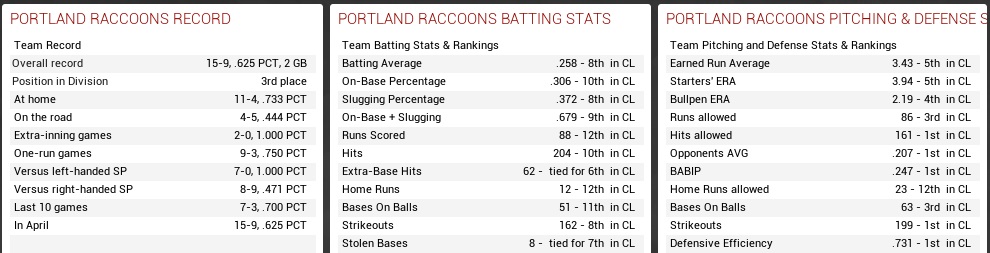 Here came a team with good pitching. Yikes. They ranked tied for second in runs allowed in the Federal League, while also scoring the second-most runs (outscoring the Raccoons 165 to 103 …). There really weren’t all that many weaknesses on this team and the Cyclones might be a good bet to return to the playoffs this year. They were suffering from a number of injuries, but so far it didn’t hurt them in their efforts to lead the FL East. Projected matchups: Kelvin Yates (2-0, 3.05 ERA) vs. Santiago Chavez (1-1, 4.05 ERA) Raúl Fuentes (3-1, 3.63 ERA) vs. Luis Guerrero (3-1, 2.70 ERA) Kenichi Watanabe (2-2, 1.80 ERA) vs. Richard Williams (3-2, 5.22 ERA) Guerrero is a left-hander. Game 1 CIN: 2B Berman – 3B Bond – LF D. Morris – CF Bailey – 1B Gilbert – RF A. Johnson – SS A. Gomez – C J. Silva – P S. Chavez POR: SS Flores – LF Castro – 3B Sharp – C Bowen – 1B Quebell – RF Mays – 2B Nomura – CF Trevino – P Yates The Critters took a first inning lead on a solo home run by Tomas Castro, his second of the year. Vic Flores would add his third dinger of the year in the third inning, also extending his hitting streak to 16 games, but that was about all the Raccoons did offensively. Meanwhile, Yates had the jitters. Despite a warm applause from the home crowd whenever he came out to deliver an inning, he randomly burst into wild episodes, which resulted in the bases being loaded with one out in the fourth, with a single and two walks responsible for that. Avery Johnson plated a run with a sac fly to Trevino before Gomez’ grounder to Flores ended the inning. When Nomura and Trevino hit back-to-back singles with one out in the bottom 7th, it shot our hit output all the way to five on the day. Crespo hit for Yates, flew out, and Flores did the same. Kevin Bond didn’t miss a game-tying homer by all that much in the top of the eighth, banging a double off the top of the rightfield wall against Ed Bryan. Dan Morris ended the inning with a groundout to Quebell. It was still a nail biter when Castro drew a walk off Qi-zhen Geng in the bottom 8th, stole second (after getting thrown out once earlier), and then scored on Geng’s error. Craig Bowen had grounded to the right side, Ray Gilbert made the play, a good throw to the pitcher, but Geng had it dink off his glove. That’s how we all know Qi-zhen Geng’s efforts: not worth the oxygen consumed. The Raccoons had Quebell put on intentionally, but Yoshi would plate both runners with a 2-out single up the middle to break the score open. 5-1 Critters. Castro 2-2, 2 BB, HR, RBI; Nomura 2-4, 2 RBI; Yates 7.0 IP, 2 H, 1 R, 1 ER, 3 BB, 6 K, W (3-0); Bryan 1.1 IP, 1 H, 0 R, 0 BB, 1 K; Game 2 CIN: LF D. Morris – C J. Silva – 1B Gilbert – RF Bailey – 2B Berman – SS A. Gomez – CF MacGruder – 3B Banda – P Guerrero POR: SS Flores – LF Castro – 3B Sharp – 1B Quebell – RF Black – 2B Sato – CF Crespo – C Wood – P Fuentes As the Raccoons’ offensive ineptness continued, the first meaningful action of the game didn’t come until the fourth when Gilbert doubled and Berman singled to give the Cyclones a 1-0 lead on the lefty Fuentes. The Raccoons got their chance soon enough in the bottom of the inning. Castro led off with a single before Luis Guerrero lost the strike zone and walked Sharp and Quebell. Of course the team couldn’t buy a hit in such a situation, but still took the lead. Black hit a sac fly to plate Castro, Sato walked, and Crespo’s groundout was just barely good enough to bring home Sharp. The Cyclones intentionally walked Bobo Wood and his toothpick to get to Fuentes, who duly grounded out. Fuentes was in trouble in the sixth again. Gilbert led off with a single into center before Will Bailey hit the ball with the bottom of the bat and clonked it into the ground about one foot away from home plate. Wood nabbed Gilbert at second base, but Bailey made it to first base safely. Dennis Berman then fired a liner into deep right for a double. Luke Black got a good bounce off the wall while the Cyclones waved Bailey around third base. Black to Quebell to Wood – out! Fuentes struck out Aurelio Gomez to starve Berman at third base and we continued to lead 2-1. In the eighth Marcos Bruno offered a leadoff walk to Dan Morris before Julio Silva hit a horrendous bunt right back to Bruno, who started the double play, and Gilbert grounded out to short. Flores led off the bottom 8th with a single after going 0-3 so far, but we also found our way into a double play, Bowen the culprit, hitting for Quebell with Guerrero still dealing for Cincy. No, the score remained 2-1, and it was on Angel now. Rain began to fall (it’s Portland after all; oops, rhyming again), and the inevitable Berman doubled to the left corner with one out. Gomez singled, putting runners on the corners. At 0-2 on MacGruder, the game was shortly delayed for rain that soon stopped. MacGruder finished his strikeout, and then Al Graves pinch-hit, a .286 lefty with 14 AB and no homers. Was Angel still good? His third K of the day was answer enough. 2-1 Coons! Sharp 1-2, 2 BB, 2B; Sato 1-2, BB; Fuentes 7.0 IP, 5 H, 1 R, 1 ER, 3 BB, 6 K, W (4-1); PHEW!! Boys! I … I can’t … can you please …!! We had four hits in this game. How few hits can you have and still win games fairly regularly? Well, depends on whether you lead your league in allowing the least runs, which we now do. Least runs scored, least runs allowed. We’re the ****ing 1980s Indians. Game 3 CIN: 2B Berman – 3B Banda – LF D. Morris – CF Bailey – 1B Gilbert – RF A. Johnson – SS A. Gomez – C J. Silva – P R. Williams POR: SS Flores – LF Castro – 3B Sharp – C Bowen – 1B Quebell – RF Black – 2B Nomura – CF Trevino – P Watanabe Both teams scored in the first, 1-1, and we had a 35-minute rain delay by the second. Visit Portland, the City of Precipitation! Yoshi Nomura slipped, fell, and couldn’t get up in the third inning, and while the 
