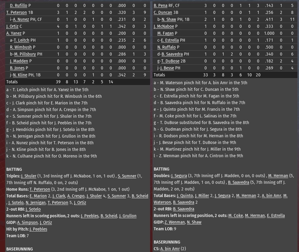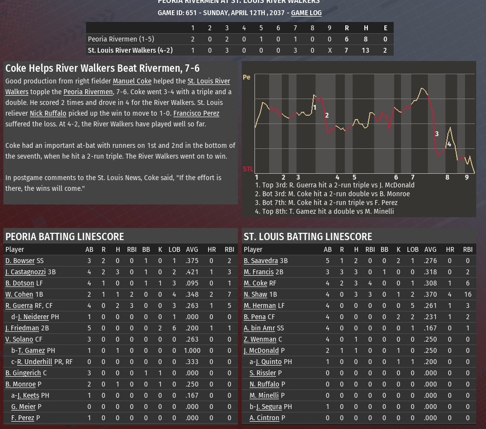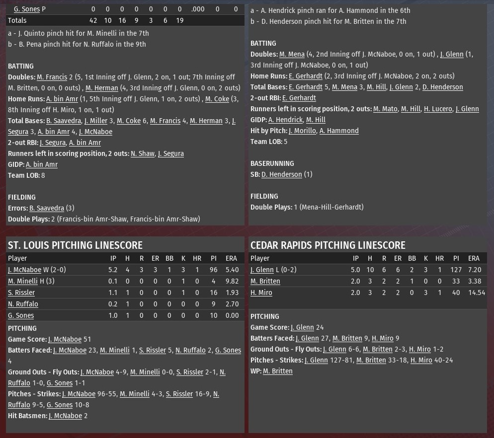 St. Louis jumped out in front with four runs in the top of the first inning and also got a strong start from rookie Ming Xiang, as the River Walkers downed Cedar Rapids 7-1 at Connie Park Park (1960). Mark Herman provided the big blow of the top of the first with a three-run home run off Grapplers starting pitcher Joey Ross. Before that, though, Manuel Coke had scored Bob Saavedra with a sacrifice fly. Saavedra had led off the game with a bunt single. He had moved to third when Jackson Miller reached on an error by Cedar Rapids second baseman Mark Hill. The St. Louis lead grew to 5-0 in the top of the fourth, when Jean Segura led off with a triple off Ross. He scored when catcher Tim Jurgensen was charged with a passed ball. Now up 5-1, the final two Walkers runs came in the eighth. Nick Shaw led off the inning with his fifth homer, and 20th RBI, of the young season. It came off Keith Kirby. Herman later doubled and scored when Abdul-Nasser bin amr singled off Jordyn Ibarra. Xiang, making just his second start in the MBL after signing with St. Louis in the offseason, didn't allow a hit until Miguel Mena hit a solo homer with one out in the bottom of the fifth. Altogether, Xiang (1-0) went 5.2 innings, allowing the one run on two hits. He struck out six and walked three. Maxilliano Minelli, also a rookie, got the final out of the sixth and first out of the seventh. Ron Cox finished off the seventh for St. Louis. Brett McVey kept the Grapplers off the scoreboard in the eighth and ninth. |