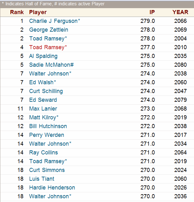 -------------------------------------------- Nolan Ryan was selected with the 14th pick of the 2061 draft by the Angels...that's pretty cool. In this environment, Ryan only had 10 complete games. He only had one shut out. That shutout, however, was a no-hitter. That is very cool. Ryan pitched for bad teams for the vast majority of his career. Pitching through the year of 2086, Ryan appeared in only one post season. In spite of this poor support, he compiled a record of 246-192 (11th on the win list, two more than Percy Coleman). His career OOTP ERA was a better than average 4.01. Ryan is known for strikeouts. He struck them out just fine, here. He led the league in Ks 5 times, fanning 300 7 times en route to 5614 in his career (3rd, between Walter and Randy Johnson). He also walked a lot of hitters. He led the league in walks 7 times. His 2105 free passes are the most in league history. Ryan never won more than 16 games in a season. He had a LOT of NDs. He made 652 career starts (3rd, one fewer than Walter Johnson, 2 more than Jim St Vrain) and threw 3981 innings (11th, one spot behind Bert Blyleven). He won double digits 14 times. He lost double digits only 9 times. A 3 time All Star, Ryan enters the HOF at the age of 44 on his first ballot. Black Ink: 37 (84) Gray Ink: 136 (254) HOFm: 144 (256) HOFs: 42 (55) Gorilla Composite: 3.3 (6.0) ------------------------------------------------ Eddie Collins Sr was the top pick of the 2057 draft. he went to the Cubs (no shock they had a top pick...shocking that they used it well). Along with HOFers Joe Adcock and Don Mincher, Collins brought a WS title to the North Side. 3 HOFers should be enough to get a title, but not always, for the Cubs. Collins batted .384 and scored 135 runs and had 79 stolen bases as he took first of 2 batting titles, his second of 7 SB titles, and his first of 2 MVPs. Collins enters the HOF as the league's career hits leader with 3793. He also enters the HOF as the league's career SB leader with 993. He is also the career leader in games (2998), AB (11195), runs (2223), singles (2919), and CS (286). Collins hit .300 in each of his first 19 seasons. In his 20th he batted .298. In 2068, now a Detroit Tiger, Collins had his best season, and one of the best in league history. He hit a still standing league record .427 with a still standing league record OBP of .514. His 194 singles on 253 hits are also league marks still standing. He scored a career high 140 runs and walked a career high 100 times. His slugging % of .588 gave him a npa OPS+ of 187 for this MVP season. Collins hit .400 in three seasons, but his 2068 season is the only one in which he had a qualifying number of PA. Collins hit an occasional bomb, 171. He hit 625 doubles (7th, 2 fewer than Hal Chase) and 78 triples (t-19th, Dan Brouthers). He drew 1662 walks (3rd, between Mickey Mantle and Eddie Yost) and was plunked 99 times. That contributed to a career slash line of 339/426/454 (6th, between Georfe Sisler and Johnny Mize/6th, one spot ahead of Stan Musial/*). Collins had 1288 career RBI. In 2072 he was teamed with Eppa Rixey and Richie Hebner on the Tiger's championship team. In 2074 he and Rixey stamped the trophy, again. The Tigers won 9 straight divisions with Collins on board. A 12 time All Star, ROY recipient, and winner of a Gold Glove, Collins enters the HOF at the age of 51 in his first year of eligibility. Black Ink: 43 (19) Gray Ink: 177 (271) HOFm: 390 (250) HOFs: 76 (72) Gorilla Composite: 6.9 (5.6) ------------------------------------------- Eddie Collins has entered all three OOTP HOF. Nolan Ryan enters his first OOTP HOF. Ryan and Collins are the 48th and 49th RL HOFers to be inducted here. Notable players joining the league in 2092 include: Ted Simmons, James Burke, Willie Horton, Mickey Rivers, Hank Thompson and Johnny Hopp. |