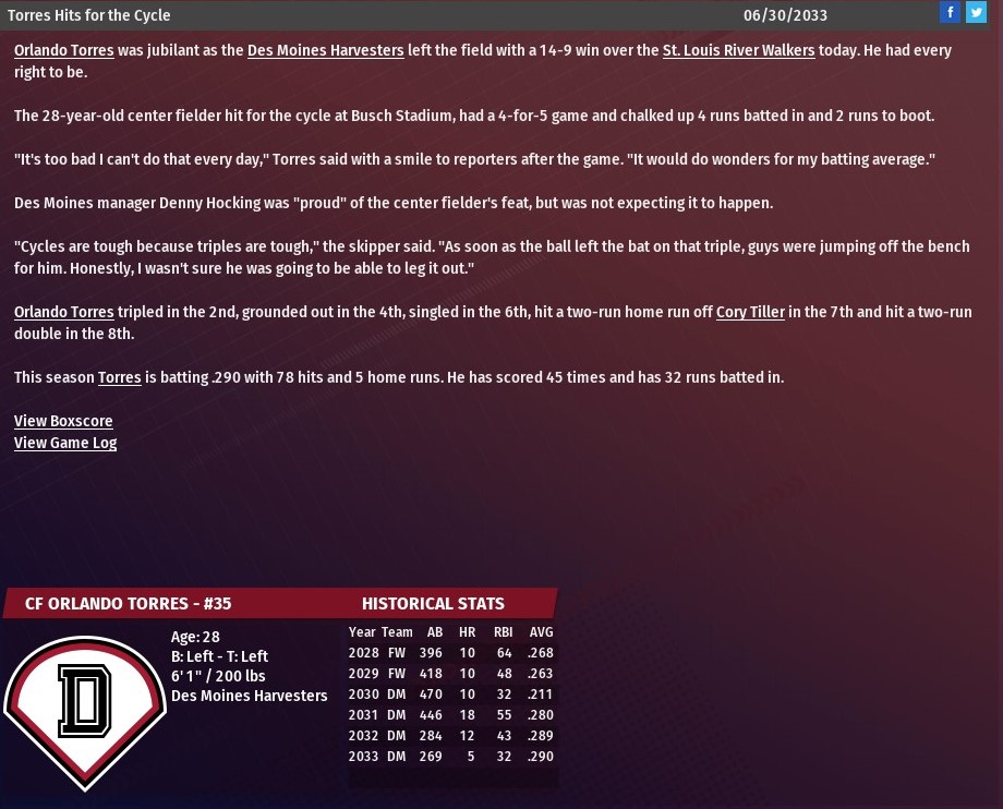 Tied 9-9, Orlando Torres hit a two-run homer off St. Louis reliever Cory Tiller in the top of the seventh inning to snap the tie, and Des Moines went on for a 14-9 win at Busch Stadium (2006). The win was the second for the Harvesters in the three-game series. The River Walkers had evened the game at 9-9 in the bottom of the sixth on a grand slam from Jose Ramirez off Des Moines relief pitcher John Curtiss. It didn't stayed tied for long. On the mound for the first time since a stay on the injured list, Tiller walked Ubaldo Capponi to open the top of the seventh. Two pitches later, on a 1-0 count, Torres bashed his homer, over the right-field wall to put the Harvesters in front for good. It was quite a day for Torres, as he hit for the cycle going 4 for 5 with a single, double, triple, homer, two runs scored and four RBIs. Des Moines kept on adding the runs over the final two innings. Torres had a two-run double off Nick Ruffalo in the eighth to make it 13-9. A throwing error by Javon Gill in the ninth helped make it 14-9. Harvesters starting pitcher Teddy Loetzch got rocked for five runs on nine hits in 4.2 innings. Six relievers followed him to the mound. Juan Amezquita got the final out of the fifth inning. John Cutriss (0.1 IP) and Ryan Cusick (0.2) combined to work the sixth. Cusick (3-1) would earn the win. Yuki Matsui, Cory Burch and Travis Krogman would combine to close out the game, all working a scoreless inning. |