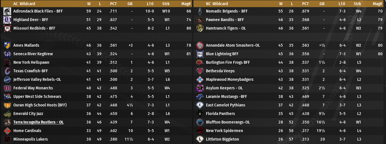 It's a tale of two halves, as Left Coast, Norwood, Ring Road and Ewa Beach sit jumbled atop the OL standings, while K-Town, Waffletown and Port Ruppert appear to be operating under the mistaken belief there is some sort of prize for the worst record ![]() Overall, two OL teams sit in playoff spots early on, with Norwood comfortably atop the AC East division by 9 games, and Waffletown holding down the top wild card position. |