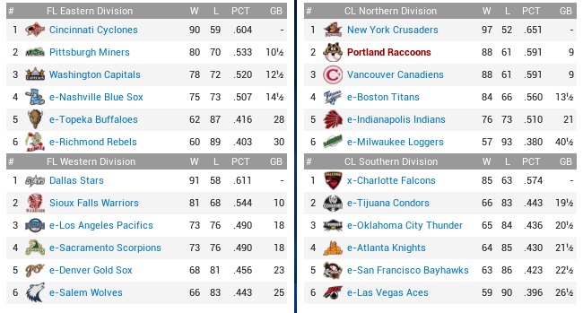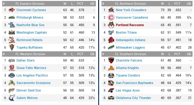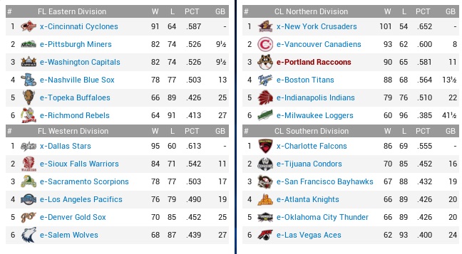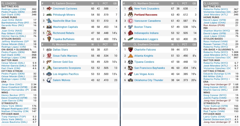 Unless the Raccoons could sweep the Crusaders in this 4-game set, the remaining three weeks of the year were already meaningless, and recent track record showed that they probably wouldn’t. We had no means to compete with a team that led the Continental League in both offense and pitching. Over the season, the Crusaders had won nine of the 14 previous contests. Projected matchups: Colin Baldwin (8-9, 3.22 ERA) vs. Whit Reeves (15-4, 2.71 ERA) Kelvin Yates (10-7, 4.51 ERA) vs. Greg Connor (21-4, 2.38 ERA) Jong-hoo Umberger (17-4, 1.99 ERA) vs. David Estrada (13-8, 3.54 ERA) Nick Brown (13-10, 3.51 ERA) vs. Angel Javier (10-12, 3.39 ERA) Game 1 NYC: CF R. Pena – 2B R. Garza – LF M. Ortíz – RF S. Martin – 3B Reece – SS Butler – 1B A. Munoz – C D. Anderson – P Reeves POR: 1B Quebell – 3B R. Martinez – LF Alston – RF Black – SS Barrón – C Bowen – 2B Nomura – CF S. Trevino – P Baldwin The Crusaders were dealt an early blow when Whit Reeves had to leave the game with an injury after facing only three batters, but it didn’t deter them for long. Stanton Martin opened the second inning with his 24th shot of the year to put them ahead 1-0, and while Baldwin struck out five the first time through the order, that run also included another leadoff jack in the third inning by Daryl Anderson. From there, the Crusaders quickly stacked the bases for Martin to bat with three men on, but Baldwin, who had walked the previous two batters, continued to be wild and hit one right into Stanton Martin, pushing in the third run before Sonny Reece and Bob Butler both struck out. Baldwin somehow struck out ten batters in five innings while also allowing four runs. The Raccoons had stranded runners on second and third in the first inning, and runners on first and second in the second inning. They didn’t get another runner until a Tim Poe error put Juan Barrón on base to start the seventh inning. Such are the terms of the Crusaders being a better team: no runners for the brown team for four innings. 2-out singles by Trevino and Pruitt loaded the bases for Quebell, who popped out to “Clockwork” Martin in rightfield. Richardson allowed a homer to Sonny Reece and two runs total in the eighth, and while Angel Casas was an awesome pitcher, he was not an awesome defender, and a throwing error of his led to two more runs, unearned, in the ninth inning. When Craig Bowen hit his 20th home run off Scott Hood in the bottom 9th, there was nobody left to cheer. 8-2 Crusaders. Pruitt (PH) 1-1; Parker 2.0 IP, 0 H, 0 R, 1 BB, 0 K; Dan Parker has achieved an ERA under nine now. Good, good. Game 2 NYC: CF R. Pena – 2B R. Garza – LF M. Ortíz – RF S. Martin – 3B Reece – SS Butler – 1B A. Munoz – C D. Anderson – P Connor POR: 1B Quebell – CF Fletcher – LF Alston – RF Black – C Bowen – 3B R. Martinez – SS Barrón – 2B Nomura – P Yates Neil Reece had been a fan favorite for more than a decade, but every day we developed a softer spot for Sonny Reece (not related, by the way, as you might already have guessed from their diametrically opposite skin colors). After Connor sat down the first two batters in the first inning, Ron Alston drew a walk. Two soft singles loaded the bases for Martinez, who grounded to his fellow third baseman Sonny, whose throw to first was in the dirt and offline and forced Anastasio Munoz to scamper after it. All hands safe, the Raccoons led 1-0, but weren’t done, instead plating pairs of runs each on a Barrón single and a Yoshi double to go up 5-0. All runs were unearned, of course. Connor made an error himself the next inning to put Alston on base with two outs again, and the Duke happily doubled him in to get to 6-0, while Yates faced the minimum (including a Munoz single and double play) through three innings. The Crusaders put their first two men on in the fourth, but never managed to reach third base. Through seven, Yates appeared to be cruising on a 3-hitter with eight strikeouts, but after two walks and an almost-homer by Munoz he got removed from the game. Ed Bryan pitched to Roberto Pena with two on and two out and allowed a rocket to right that the Duke made a mighty fine play on to end the inning. Off the bat, that one had cried out “TWO RUNS! TWO RUNS!” for everybody to hear. After that, I wanted to get the ninth inning for cheap from Kaz Kichida, which predictably resulted in two on and nobody out before Marcos Bruno arrived just in time to allow a 3-run homer to Stanton Martin, and then a solo home run to Sonny Reece. So we DID have to break out Angel after all, and the game was over in five pitches, including a strikeout. 6-4 Raccoons. Black 2-4, 2B, RBI; Yates 7.2 IP, 3 H, 0 R, 2 BB, 8 K, W (11-7); Okay, let’s add Bruno to the list of guys who are on mental holidays already. And who can blame them? I can’t wait for these meaningless games to run out, either. And it is true, none of our runs in this game were earned, and we never were particularly close to scoring after the second inning, or in other words: from the third through the eighth, the Raccoons managed one (1) more hit. I don’t know what happened. They might have found the Capt’n Coma stash… Game 3 NYC: CF R. Pena – 2B R. Garza – LF M. Ortíz – RF S. Martin – 3B Reece – SS Butler – 1B M. Williams – C D. Anderson – P D. Estrada POR: 1B Quebell – CF Fletcher – LF Alston – RF Black – C Bowen – 3B R. Martinez – SS Barrón – 2B Pollack – P Umberger By now the sparkle had also completely come off of Umberger, who allowed a run in the first, singled in by “Clockwork” with two outs, and three in the second inning, with the first three batters, all right-handers, effortlessly lining hits off him. The Raccoons’ offensive efforts remained extremely pathetic. Through six innings, they hit all of two singles off David Estrada, a left-hander whose stats wouldn’t suggest he was a dominator otherwise. Ron Alston hit a double i