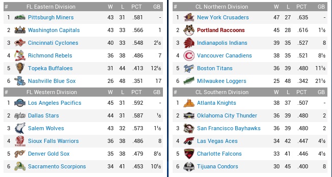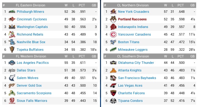 The Loggers were on a 3-game winning streak, so we’d better cover our heads. There was the thing with them still being 11th in both runs scored and runs allowed, but a streak is a streak. Yes, the Critters had their own 3-game winning streak. The Loggers were without SP Fabien Armand and veteran infielder Bartolo Hernandez, who were on the DL. Projected matchups: Javier Cruz (4-1, 2.80 ERA) vs. Ramón Huertas (0-1, 1.80 ERA) Nick Brown (2-2, 1.43 ERA) vs. A.J. Bartels (1-4, 5.77 ERA) Greg Grams (4-0, 4.11 ERA) vs. Fernando Cruz (2-2, 4.59 ERA) Colin Baldwin (2-3, 3.48 ERA) vs. William Lloyd (1-4, 4.98 ERA) We get two right-handers first, two left-handers later. Huertas had pitched in single-A ball at the age of 31 this year, so he was probably not going to hold his ERA from two major league games forever. Brown’s matchup looks like a 13-inning game that ends 2-1 for any team on a passed ball. The outlook on Luke Black was that he might be fine by the end of the week, and was not put on the DL and instead kept around for pinch-hitting, but he wouldn’t start any games, since he shouldn’t throw with that tender elbow. Game 1 POR: CF Castro – 2B Correa – RF Alston – 1B Quebell – LF Pruitt – C De La Parra – SS Roudabush – 3B M. Gutierrez – P J. Cruz MIL: LF J.R. Richardson – CF J. Garcia – 1B Hiwalani – C Baca – SS T. Johnson – 2B Tolwith – RF Delaney – 3B K. Scott – P Huertas Neither pitcher looked like much. Castro doubled and scored on Correa’s single in the first, but three hits scored two runs off Javier Cruz right away in the bottom of the inning. Castro got on with a single in the third, stole second, scored on another Correa single to tie the game, and then Alston lifted his ninth bomb of the season to put the Raccoons up 4-2, only for Cruz to give up another run in the bottom of the same inning, and the lead didn’t hold past the fifth inning, when Bakile Hiwalani showed he wasn’t quite dead yet and rapped his third hit of the day, a 2-run homer off a hapless Cruz. The Raccoons failed to knock Huertas from the game despite putting Nomura and Castro on base to start the seventh inning, but this time Correa hit into a double play and Alston rolled one to Tolwith, who had been drilled by Cruz to start the sixth inning, leading to Cruz’ banishment. The catching mook hit into an inning-ending double play in the eighth, still against Huertas. Black hit for Gutierrez in the ninth, reached on an error, and then Nomura hit … into one last double play. 5-4 Loggers. Castro 3-4; Correa 3-4, 2B, 2 RBI; Well, this was really a game we shouldn’t lose. But … hnggh. The Crusaders had Monday off, shrinking our lead to half a game. Game 2 POR: CF Castro – SS Correa – RF Alston – 1B Quebell – LF Pruitt – 2B Nomura – 3B Sharp – C Esquivel – P Brown MIL: LF J.R. Richardson – 1B J. Hernandez – RF Hiwalani – CF T. Austin – SS T. Johnson – C Olson – 3B S. Johnson – 2B Jennings – P Bartels Four singles and a walk led to three runs for the Raccoons in the top 1st, very uncharacteristic for a Nick Brown start. But you know what was the pure definition of a Nick Brown start? Rain. And it came in the second inning. After a 32-minute delay, the first pitcher Brownie faced, Mike Olson, homered to right, the Loggers’ first offensive achievement in the contest. The Coons knew how to slug, too, though, and chased Bartels in the top of the third, plating another four runs off him, including a 3-run homer by Sergio Esquivel, yet Brownie was messed up after the rain and was tagged with a 2-run homer by J.R. Richardson in the bottom of the same inning. So that’s a 7-3 game and still six innings left. The Coons added two runs off long man Gabriel Caro in the middle innings, but Brown didn’t get out of the sixth, in which Hiwalani and Tom Johnson hit doubles off him. He left with a 9-4 lead, with Ted Reese replacing him, who allowed Johnson to score by walking Spencer Johnson before Esquivel threw away a Dave Jennings grounder. For a while the goal was then to have Reese pitch the game to conclusion, but he sucked himself out of a long save in due time. In the bottom 8th, with two out, Olson singled and Johnson doubled, which was enough danger to the W that Law Rockburn came in to strike out Jennings, which he accomplished, and then pitched a fairly quick ninth, too. This time the Loggers ended the game with a double play hit into, Joaquín Hernandez being the culprit. 9-5 Brownies. Correa 2-5; Alston 3-4, BB; Quebell 2-4, BB, RBI; Pruitt 2-4, 2B, 2 RBI; Sharp 2-5, 2 RBI; Esquivel 2-5, 3 RBI; Rockburn 1.1 IP, 1 H, 0 R, 0 BB, 2 K, SV (1); When it really wasn’t pretty, it was good enough. Baseball was the strangest game, and so Nick Brown won his 100th career game in a shoddy outing that wasn’t quite a 13-inning, 2-1 affair. Him being 31 years and 162 days old, nobody should gamble on 200. But he struck out seven to run his career strikeout total to 1,656. He lost the CL ERA lead, though, with this shoddy outing, dropping behind SFB Tyler Sullivan (1.76 to Brown’s 1.93), who also leads the league in strikeouts. His five wins tie him for second behind OCT Daniel Dickerson’s seven victories. Game 3 POR: LF Castro – 2B Correa – RF Alston – 1B Pruitt – 3B Sharp – C Esquivel – SS Roudabush – CF Trevino – P Grams MIL: LF J.R. Richardson – CF J. Garcia – 1B Hiwalani – RF T. Austin – C Baca – SS T. Johnson – 2B Tolwith – 3B Jennings – P F. Cruz Sharp was front and center in the first inning, first leaving two men in scoring position in the Coons’ batting half, then putting Richardson on base with a horrendous throwing error, but luckily the Loggers left their men at third base as well. Richardson struck out to leave the bases loaded in the bottom 2nd, with three hard singles hit off Grams to get them stocked in the first place. Again, the Raccoons would score first. Pruitt reached in the fourth, stole s