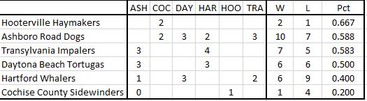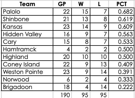 In PT play we still have seven teams in the playoff hunt while the other four Coney Island, Hamtramck, Brigadoon and Norwood all sit in the relegation zone. |