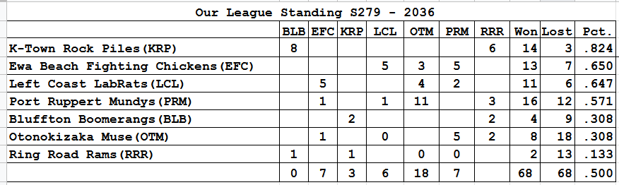 The Rebels, probably the OL team most victimized by OOTP's scheduling quirks in recent weeks, showed what they can do given a chance, jumping out to a swift lead. Scheduling has still been a little thin, so expect more of a race to unfold.