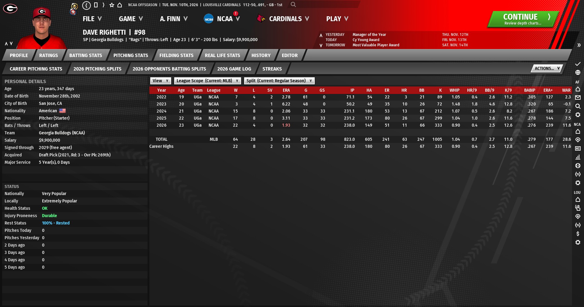 Dave Righetti of the Georgia Bulldogs fired on all cylinders in 2026 and dominated American League batters. For his superb season he has been selected the Cy Young Award winner. During the year Righetti compiled a 22-4 record, a 1.93 ERA and 333 strikeouts while working 238 innings. He received 146 first place votes, as a unanimous winner. Bill Donovan of the Montana State Bobcats finished second in voting, while Watty Clark of the Long Beach State Dirtbags finished third. Player - Team - First Place - Total Points Dave Righetti - Georgia Bulldogs - 146 - 1022 Bill Donovan - Montana State Bobcats - 0 - 482 Watty Clark - Long Beach State Dirtbags - 0 - 456 Mark Prior - Florida International Panthers - 0 - 203 Russ Bauers - Ole Miss Rebels - 0 - 169 Ed Morris - North Dakota Fighting Hawks - 0 - 60 Pat Malone - Rice Owls - 0 - 46 Bob Rush - Gonzaga Bulldogs - 0 - 21 Ed Killian - Texas Tech Red Raiders - 0 - 13 Carl Hubbell - Georgia Bulldogs - 0 - 6 Charles Bender - Long Beach State Dirtbags - 0 - 4 |