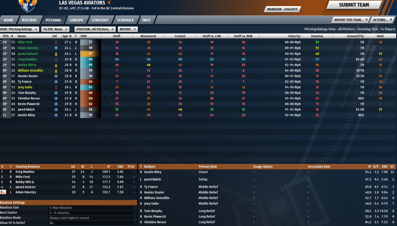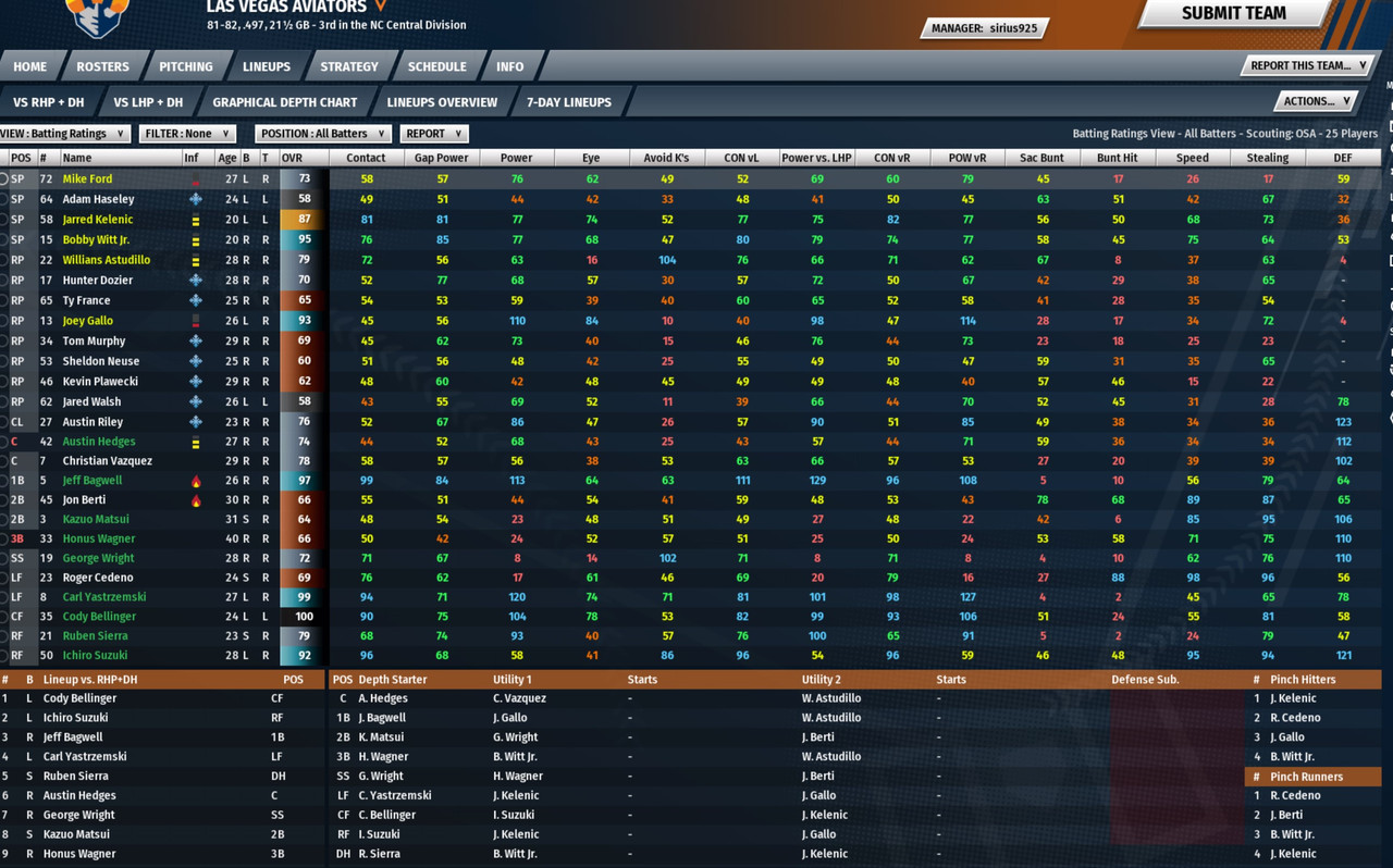 Possibly actually just AFK?? I've got him in my league now (2034) he's running the same lineup as you experienced with him in May. He hasn't made it out of rookie league. This just seems like a player who gave up, and now this terrible lineup is floating through the system. I beat him by 20 runs three games in a row. Unfortunately, he's not in my division, and this disparity will impact all the teams fighting for playoffs. That division will likely get both wildcards, and a tonne of points to get better with. I also understand that HR's are balanced across the league, so that division will probably have the HR leader as well, = more points.