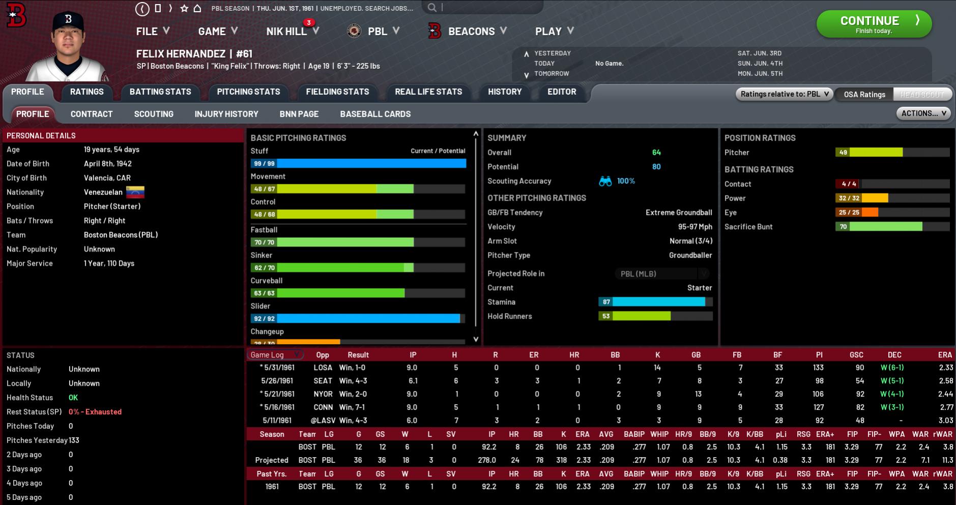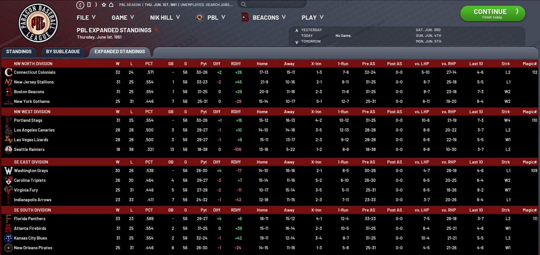 Just a game separates the three top teams, with Connecticut sitting alone in first on 32-24. New Jersey and Boston’s strong home form has helped them keep pace with the Colonials and New York put together a couple of strong late wins to give them some momentum heading into June. West Division A real turnaround for Portland with their 20-9 month leapfrogging them into first place, 3 games clear of both Los Angeles and Las Vegas, who continue to be almost inseparable. Poor old Seattle is having a hell of a time of it, with their run differential having blown out to a nasty -106. They are now 10 adrift of the Canaries and Lizards and already look no hope of being competitive this season. South Division Florida is in the same boat as Washington—a league-best 33-23 record but a run diff of just +6, which compares poorly to both Carolina (+39) and Kansas City (+42), who are tied for second place just 2 games in arrears. New Orleans – 8 GB at 25-31 – are finding it tough going and will need to get things moving in the right direction if they want to avoid being dropped off by the other three. East Division Washington still leads, but now by only 4 games, and this division has really tightened up of late with the last placed Arrows only trailing the Grays by 7. Washington’s -17 run differential despite their 30-26 record indicates they are winning by small amounts and losing big, which is a real concern. I wouldn’t be at all surprised to see Virginia atop this division same time next month. They are 8-2 for their last 10 and have started playing some really good baseball, as their 19-10 May after that horror 6-21 April attests.