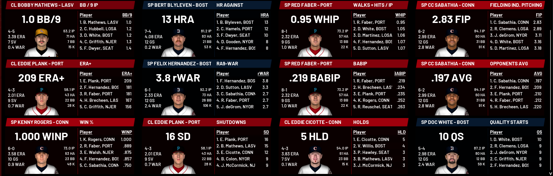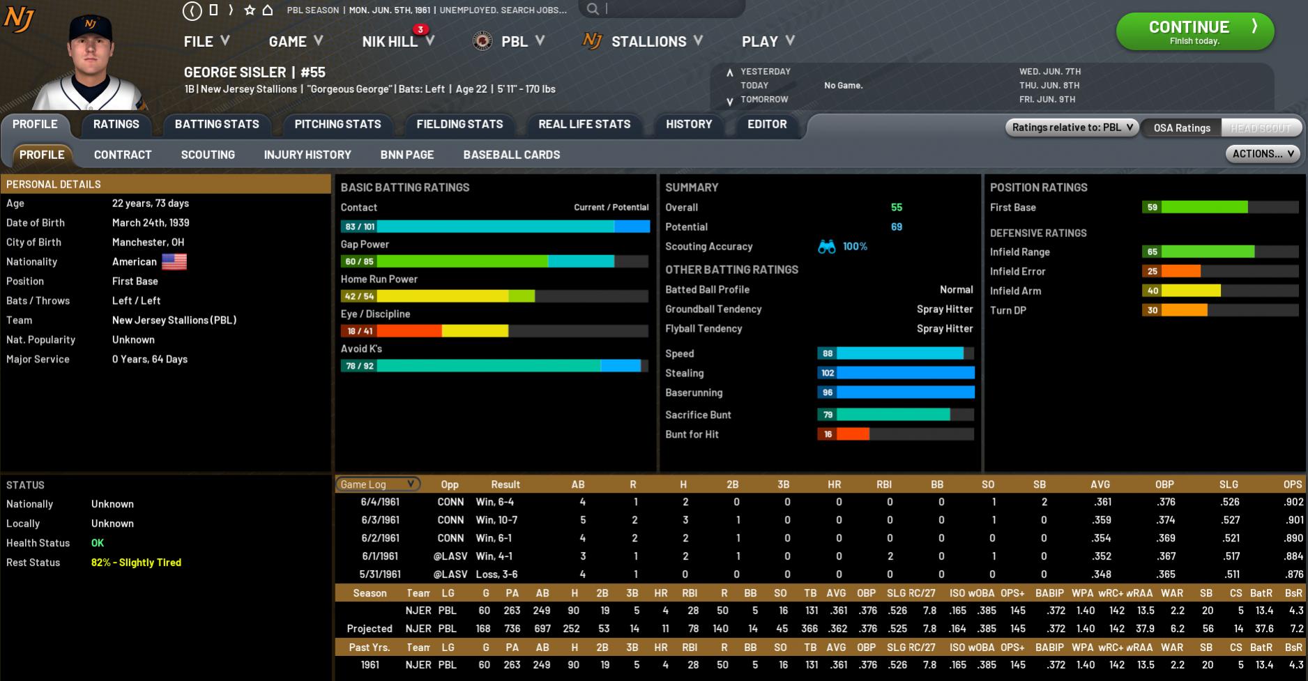 Omnibus Park – Las Vegas, NV; 1.05 pm LASV: Mark Langston (8-4, 4.93) PORT: Jim Palmer (4-6, 3.82) Good Afternoon and thanks for tuning in to PBLTV’s Game of the Week, I’m your host Nik Hill. You are in for a real treat tonight as the Portland Stags – arguably the hottest team in the league in recent weeks – take on the Las Vegas Lizards, and if you haven’t seen it before then welcome to Omnibus Park, which it’s safe to say is a ballpark like no other and very much in keeping with the locale in which it is situated. As I mentioned, the Stags have been red hot of late, putting together a 20-9 May that has seen them pull 5 games clear in the West division. Contributors from top to bottom in this lineup and a pretty solid pitching staff makes them an extremely difficult opponent indeed. That said, Las Vegas had no trouble unpicking them yesterday in a 17-4 rout, with second-baseman Rod Carew and catcher Ted Simmons in particular having big games as “Big Cat” Harry Brecheen went the distance for a complete game victory. Tricky Lizards southpaw Mark Langston will be hoping for a similar outcome here today, as he faces righty Jim Palmer in what shapes as a real humdinger. Both have had reasonable starts to the season and have deep pitch arrays to call upon, so I’m not expecting tonday to be another slugfest. Unfortunately our friend Juliana Scott is ill tonight, so rather than a live cross we’re going to have to make do with a quick chat I had about an hour ago with Las Vegas skipper Leo "the Lip" Durocher. Nik Hill: Leo thanks for taking the time to talk with us, your boys put together their first really dominant performance yesterday, but it has been a bit of a struggle for the club so far. What’s your take on the season to this point? Leo Durocher: We just haven’t been good enough for the most part, plain and simple. NH: Where in particular do you think you’ve let yourselves down? LD: Across the board. We haven’t been terrible by any stretch, but I’m not really close to happy with any aspect of our game so far. NH: Is that just a function of the squad being so raw and inexperienced, or is there something more to it? LD: That fact certainly plays its part, and we’re OK with that. But all the players and clubs are in the same boat, so it’s no excuse. NH: Plenty of positives as well, though. Burkett has been great. Bonds has shown plus-power that looks like it has plenty of blue sky, the pitching has been solid enough on the whole. LD: Agreed. It’s certainly not panic stations or anything, but we’re going to need to start stringing some good results together or this Portland team is going to run away with it. NH: Langston on the mound for you tonight, what will your instructions to him be? LD: Mark and I had a good talk in the team rooms just a little while ago and he seems up for a big challenge today. I try not to get in my pitcher’s head so close to game time, they know what they need to do and I’d only go confusing matters if I did. Mark’s been a bit unlucky in a couple of his recent starts, but I think he’s on the right track. He just needs to trust his pitches and let the rest fall into place. NH: I really like the look of Martin Dihigo, can you tell us a bit more about him? LD: One of the most naturally-gifted ballplayers I’ve ever seen. Excellent game instincts, a real general out in the field. More pop than it perhaps looks at the moment. I’m not talking home-run pop, more extra-base pop. I expect he’ll lead the league in triples most years while still putting a few in the seats. An absolute gun. NH: It certainly looks that way. Righto Leo, I’ll let you go—good luck tonight and until we see you again. LD: Thanks Nik. Very much short and to the point is Leo, but he seems to have a quiet confidence about his group once they get a few more games under their belts. It certainly is yet another talented squad like so many others in this league. OK, a quick word from the people who pay my salary and we’ll be back with the first pitch. TOP 1ST Just a single by Magee for the visitors. BOTTOM 1ST Palmer begins confidently with a clean inning. TOP 2ND Another two-out hit for Portland, this time to Paul Waner, but nothing comes of it. BOTTOM 2ND Singles to Bonds and Dihigo put them at the points with none out, and another one to Brouthers opens the scoring. Palmer regroups and does well to keep it at that. Las Vegas 1, Portland 0 TOP 3RD A 1-2-3 inning for Langston, who has 5 strikeouts over the first 3. BOTTOM 3RD A Carew single is all for the Lizards. TOP 4TH Langston with no problems, now having retired 7 in a row. BOTTOM 4TH The hosts add to their lead, as Dihigo doubles with one out and eventually scores on a Sosa groundout. Las Vegas 2, Portland 0 TOP 5TH 10 down in a row now for Langston, with 8 Ks. BOTTOM 5TH A couple of baserunners for Las Vegas but they can’t convert. TOP 6TH Langston shrugs off an error at 3B by Ripken and a wild pitch to keep his clean sheet intact. BOTTOM 6TH Dihigo gets his third hit of the game but is stranded at third. TOP 7TH Another poor misplay by Ripken puts Mantle aboard with no outs and a walk to Munson ramps up the pressure. Bell moves them around with a groundout and Jimmy Collins comes into the game with immediate impact, doubling both runners in to tie the game at 2. That’s it for Langston, who understandably glares at Ripken as he trudges off, but the introduction of Bobby Mathews doesn’t help as Jim Whitney puts the Stags in front for the first time with an RBI single, then Rogers Hornsby makes it 4-2 with a run-scoring double. A Campaneris triple plates him to stretch Portland’s lead to 3. Portland 5, Las Vegas 2 BOTTOM 7TH The Lizards look shell-shocked and go down in order. TOP 8TH A hit but that’s all for Portland. BOTTOM 8TH Now it’s Palmer who’s looking strong as he sends them three-up, three-down. TOP 9TH Not sure why Durocher leaves him in, as Mathews gets hammered again 