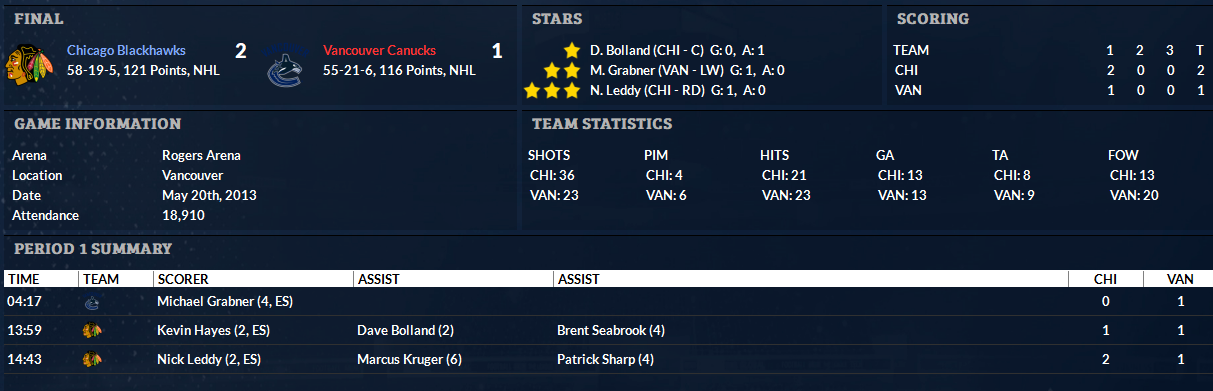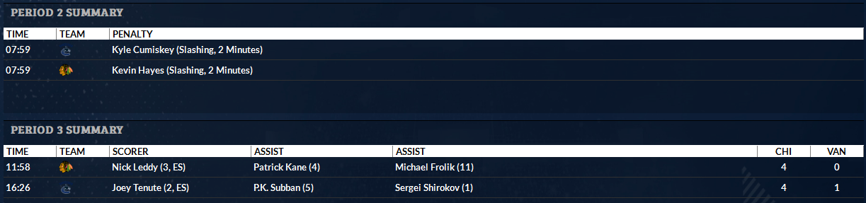 Blackhawks 4 @ Canucks 1 (Blackhawks win series 4-0) Enver Lisin (still nursing an injury) and Anton Rodin draw back into the lineup, taking Chris Neil and Brandon Yip out. The Blackhawks got the early jump though, with Patrick Kane finally breaking through and scoring. Bolland and Stalberg would add goals to make it 3-0 at the end of the first. The Canucks played probably their best all around game of the series, but couldn't get one by Crawford in the second, and it was only after Nick Leddy's third period tally put the game far out of reach that Joey Tenute spoiled the shutout. What a night for Jacob Markstrom's worst game of the playoffs. With the team playing consistently good defense in front of him for sixty minutes, he let in four goals on just 21 shots. Cue the goalie controversy all offseason. Penguins 0 @ Flyers 1 (Penguins lead series 3-1) Claude Giroux returned and made his mark early, drawing a hooking penalty on his first shift and then setting up the powerplay goal less than a minute in. Bobrovsky made 20 saves in the first and 36 total for the shutout as the Flyers stay alive. |