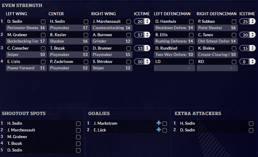 Results: W 6-2 @ TOR - Lack gets the start, Burrows gets two goals, matching his total all year, and Hank gets two goals and assist, while P.K. is the first star with three assists, and Thoresen keeps his point streak alive since joining the lineup, picking up another assist W 4-0 vs PHX - Markstrom with the shutout, Henrik continues his stellar run with a goal and an assist, we outshoot them 43-20, Thoresen keeps his point streak going with another assist W 3-0 vs SJS - second straight shutout for Markstrom, although he only had to make 17 saves, and Cory Conacher finally gets rewarded with his second goal of the year, Thoresen's run of assists finally ends W 4-1 vs LAK W 4-1 vs ANA - Lack starts, Tyler Bozak goes off with two goals and an assist, and we outshoot them 45-13 W 3-1 @ SJS - we are currently first in the NHL, Michael Grabner with the gamewinning shorthanded goal (his ninth goal of the year, which is tied, along with Hank, for seventh in the league), Kes injures his elbow and is expected to miss a week or two (he's having a great season so far with 17 points and a +14 rating through 21 games) W 4-0 @ DAL - Malhotra comes into the lineup for Kesler, and Bozak moves up a line to fill Kes' second line role, and the team doesn't miss a beat, Hank picks up first star with two assists, but another injury to a top six forward occurs as this time it's Jon Marchessault who will be out for at least two weeks after suffering an upper body injury W 3-1 @ FLA - battle of last year's Jennings winning teammates, as Markstrom starts against Cory Schneider, Cumiskey will be ruled out with a sore foot so Tommernes takes his place and picks up an assist in the game, Malhotra picks up a goal and an assist as well, and P.K. gets his first goal of the season finally SOW 2-1 @ CBJ - Eddie Lack gets the nod in net tonight, Michael Grabner nets the shootout winner with the only goal of the shootout (Lack stopped Atkinson, Carter, and Nash) L 3-2 @ CHI - the biggest test all month, against our rival who knocked us out of the playoffs last year, and it's our first loss all month, P.K. scored a shorthanded goal, and Bozak added his ninth of the year, but it wasn't enough as Marian Hossa broke the 2-2 tie early in the third and Chicago never looked back, Markstrom was peppered with 39 shots and we again looked outclassed against the Blackhawks L 4-3 @ LAK - Tommernes with his first goal of the year, but we drop our second straight, and maybe more importantly we see two more key injuries as both Hamhuis and Bozak sustain injuries that could keep them out for a month L 4-0 vs OTT - Daniel and Kes return, but with Bozak, Hamhuis, Marchessault and Rundblad all out, we still have a fairly thinned out lineup, Lack will start in goal tonight, former Canuck Cody Hodgson had a goal and an assist against us W 4-3 vs NYR - phew, we snap the skid and end the month on a good note, opened with a three goal first period that included Danny and Hank working together to assist a Tommernes goal, man it's good to finally see those guys back together, Cory Conacher scored the gamewinner with two minutes left in the third Patrick Thoresen has been a revelation on the top line, picking up twelve points so far in fifteen games, mostly alongside Henrik, and earned enough trust from coach Trevor Linden to stay on as the third member of the line with Henrik and Daniel when Daniel returned from injury. After a rough start Hank has been lights out lately, and leads the team in scoring with ten goals and fourteen assists in twenty eight games. The second line of Grabner, Kesler, and Burrows has been consistent and productive all season, and the three have a combined twenty one goals on the year. Tyler Bozak is proving to be worth his contract so far, stepping in adequately for Kesler when he was injured and otherwise leading a third line with two rookies while producing nine goals and six assists and staying at fifty percent in the circle. Ryan Ellis continues to develop and to be the offensive leader of this defense corps, while P.K. Subban has struggled somewhate, although he is bouncing back from a rough start and seemingly finding his stride a bit lately. Chris Tanev has been quietly solid as usual, and is plus ten with eight points and sixty six blocked shots while averaging twenty minutes a night. Markstrom has settled into the starting role quite nicely, and has the best GAA of any goalie in the league who has played at least ten games. Eddie Lack is looking pretty comfortable in his rookie year as Markstrom's understudy. League notes