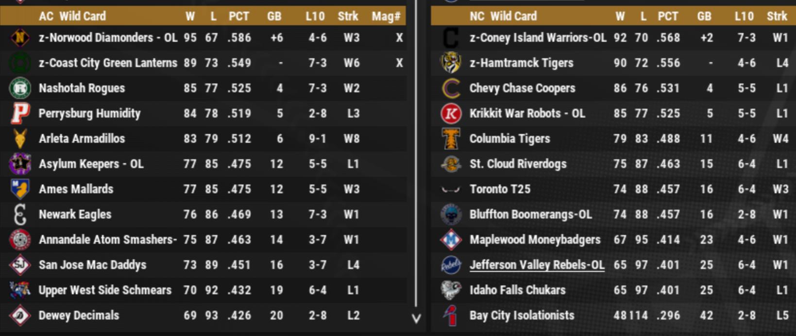 The Diamonders will be the only OL representative from the AC in the playoffs as the top seeded wildcard. In the NC Brigadoon put together a 103 win season leaving second place Coney Island in the dust. The Warriors did secure the top wildcard spot and will host our old friend Hamtramck at Come out to Play Park later this morning. If victorious they wouldn't meet Brigadoon until the sub league series should both teams get there. Jefferson Valley and Bluffton will be dropping to Silver next week. Bluffton went 2-8 in their last 10 games to seal the deal. Promotions will be decided later today. Good luck to all in the playoffs. |