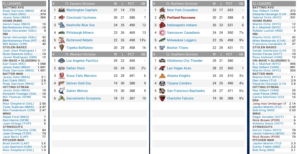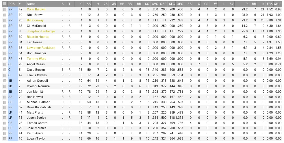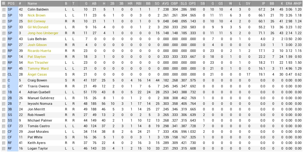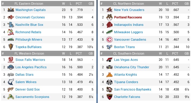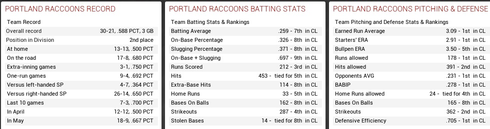 The Loggers had just dropped under .500 after holding out for much longer than anybody would have trusted them to. Their peskiness and persistence with an outrageously cheap roster and little obvious talent had also affected the Raccoons, with whom they had evenly split six games so far this year. The writing was on the wall, however, with them running a -59 run differential and ranking in the bottom 3 in both runs scored and runs allowed. They were hitting well above their weight so far and things sooner or later had to turn south hard for them. The Raccoons came off a weekend in which they routed the Titans for 33 runs (although 10 were unearned), so maybe that raging offense could spill over into this midweek set. Projected matchups: Gil McDonald (4-6, 3.50 ERA) vs. Gabriel Caro (4-5, 4.60 ERA) Colin Baldwin (6-5, 2.96 ERA) vs. Roy Thomas (4-7, 4.52 ERA) Bill Conway (6-4, 3.02 ERA) vs. Fernando Cruz (5-5, 4.29 ERA) Cruz will be a left-hander, right before our off day on Thursday. We get the Aces on the other side of that, and they currently don’t have a left-handed starter anyway, so Ayers and Howell in particular can be sure of a start on Wednesday. Daniel Sharp was currently on a rehab assignment and we weren’t sure whether we’d see him. Game 1 MIL: RF Locke – 2B K. Scott – 1B Catalo – CF Davenport – 3B Cuevas – LF J.R. Richardson – C Lemberger – SS Ito – P Caro POR: 3B Merritt – 1B Quebell – LF Pruitt – RF Morales – CF Seeley – 2B Nomura – SS Palmer – C Bowen – P McDonald That raging offense the Raccoons had displayed on the weekend clearly had been a Titans thing. They were back to their pre-Titans shoddy self by the time the Loggers showed up, and for three innings, nothing remarkable at all happened, before things got worse than just merely dull in the fourth, when Gabriel Caro struck Jose Morales in the hand, and the slugger had to leave the game, replaced by Keith Ayers. The Coons didn’t score in the inning, of course, and the score remained non-existent. The Loggers weren’t any better. When McDonald pitched too far in to Philip Locke in the top 6th and thus put the leadoff man on base, they couldn’t get him past second base, either, and that was with a Keith Scott bunt involved. While McDonald was still pitching a 2-hitter, he started to lose his command by the seventh inning. As his pitch count crossed 80, he ran two 3-ball counts to Fernando Cuevas and J.R. Richardson, who both popped out, but then allowed clean singles to Tommy Lemberger and Suketsune Ito before getting pulled. Pat Slayton retired Caro with a grounder to short. Nothing would come of Yoshi Nomura’s 2-out double in the bottom 7th – the Critters’ first hit since the first inning – either. Top 8th, Slayton allowed a leadoff triple to Locke, then struck out Scott, got a poor grounder from Leborio Catalo that kept the runner pinned down, but then walked Willie Davenport, and with lefties coming up, Ron Thrasher was asked to resolve a 2 on, 2 out situation in our favor, but allowed a single to Cuevas on the first pitch he threw, and that was that. 1-0 Loggers. Morales 1-1; McDonald 6.2 IP, 4 H, 0 R, 1 BB, 3 K; Four hits. They had four hits. They only struck out five times. They mad SIXTEEN groundball outs. Caro’s best this season so far were TEN groundball outs. There is just no point, but with the contracts involved, a rebuild might involve some generous use of rodenticide. Jose Morales had incurred no actual structural damage but his thumb was still swollen to twice the normal size. He couldn’t open a battle of water or tie his shoes on Monday night or Tuesday morning, and gripping a bat was about impossible. Here was to hoping that he was only DTD for the rest of this series, and not still incapacitated on the weekend. Game 2 MIL: 2B K. Scott – 1B Catalo – LF Davenport – RF Locke – SS Ito – C R. Hernandez – CF Covington – 3B Cuevas – P R. Thomas POR: 1B Quebell – 2B Nomura – CF Seeley – LF Pruitt – 3B Merritt – RF Taylor – SS Palmer – C McNeela – P Baldwin To say that Roy Thomas was wild would have been a wild understatement. He issued six free passes in the first three innings (while Baldwin struck out five and walked only one), and was booked for three runs, with Jason Seeley manufacturing offense in this game. He reached base in both of his at-bats in the first and third innings, stole second both times, and scored on a Pruitt double and Merritt triple, respectively. Merritt came in on a sac fly after that. Yoshi was already on first with one out when Seeley came to bat in the bottom 4th, and now doubled up the leftfield line. Both runners would score in the inning, Pruitt bringing in Yoshi with a groundout, and Merritt hit his second triple of the night to run the score to 5-0. While Thomas’ outing didn’t extend past the inning, Baldwin had struck out eight before he started to run long counts, including a number of full counts, and his pitch count shot up, reaching 95 through six. And Seeley got cocky by the bottom of the sixth. Yoshi had originally singled, but was forced on Seeley’s grounder to second. Seeley remained on first, then took off again and Raúl Hernandez’ throw went into center, tailing away from the shortstop Suketsune Ito. Seeley made it to third base with three sacks taken in the game, scored on a Pruitt single, and Pruitt would also come in when Logan Taylor decided to swing after drawing three walks so far, and hit an RBI single, 7-0. Baldwin managed to pitch seven shutout innings, but after that his pitch count was at 111, and he was hit for in the bottom 7th. Gibson and Beltran ended the game without allowing something meaningful to the Loggers. 7-0 Raccoons. Nomura 3-5; Seeley 2-4, BB, 2B; Pruitt 2-4, BB, 2B, 3 RBI; Merritt 2-4, BB, 2 3B, RBI; Taylor 1-2, 3 BB, RBI; Baldwin 7.0 IP, 3 H, 0 R, 3 BB, 8 K, W (7-5); Gibson 1.1 IP, 1 H, 0 R, 1 BB, 2 K; I do like Jason Seeley more and more, a bi