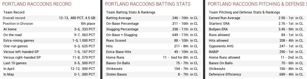 Raccoons (12-13) vs. Canadiens (12-11) – May 2-5, 2011 The Canadiens had won their last four games, while the Raccoons were in the process of losing all their dignity. While the Elks ranked only 9th in runs scored, they were a strong 3rd in runs allowed, with a -3 run differential, although part of this might be that they had played the least games in the Continental League. Their starting pitcher ranked sixth in ERA, and the bullpen fourth. The Coons had taken the season series for two consecutive years, including a tied all-time best 13-5 last season. Projected matchups: Jong-hoo Umberger (2-2, 1.95 ERA) vs. D.J. Fulgieri (0-3, 8.38 ERA) Colin Baldwin (2-1, 1.91 ERA) vs. Juichi Fujita (1-3, 3.38 ERA) Bill Conway (1-2, 3.30 ERA) vs. Rod Taylor (4-1, 1.50 ERA) Gil McDonald (0-3, 4.71 ERA) vs. Tommy Wilson (2-0, 5.32 ERA) That was a full complement of right-handed pitchers, and they do not currently have a left-hander in the rotation (the only guy we miss is 3-2 Scott Spears and his 4.50 ERA). That’s a good thing, because the horrendous Stuttercoons have only won one game from a left-hander all year (when Baldwin outdueled Takeru Sato on April 7). Game 1 VAN: LF Holland – 2B Dobson – 1B Gilbert – C Baca – 3B Suzuki – SS Rice – RF Southcott – CF Hudson – P Fulgieri POR: 3B Merritt – 2B Nomura – LF Seeley – CF Morales – RF Taylor – 1B Pruitt – C Bowen – SS Howell – P Umberger Umberger allowed three singles for one run in the first inning, with the inning ending with Logan Taylor catching a Gary Rice drive right against the wall, while the fact the Jon Merritt hit a leadoff single in the bottom of the first and Fulgieri went on to issue two walks and throw two wild pitches in the inning was merely good enough for the tying run – and that scored on the latter wild pitch. While Jose Morales finally broke into the home run list on the team with a mile high solo shot to right in the bottom 3rd (just after Seeley had fallen 15 feet short with a drive that was caught by Clint Southcott), Umberger wouldn’t stop allowing hit by hit, and the Elks tied the score right back in the fourth, and then there was Mitsuhide Suzuki’s leadoff double in the sixth inning. Umberger didn’t recover from that, gave up singles to the disgusting Southcott and John Hudson and left after the inning on a 4-2 hook. Fulgieri was still holding out in the seventh, but made a throwing error in the inning that put Rob Howell on base with one out. Adrian Quebell hit for Ricardo Huerta and walked, and the tying runs were on base for Merritt, who had one of the Raccoons three hits on the day, nursed a full count and drew a walk to fill the bags for the left-handers coming up. The Elks didn’t remove Fulgieri and paid for it with a bases-loaded walk drawn by Yoshi before Seeley popped out. Morales lined a pitch into right center, Southcott made a good play to hold him to a single, but the score still flipped in favor of the Raccoons as two runs scored, 5-4. Law Rockburn couldn’t do the eighth and was replaced after Southcott singled. Ron Thrasher took over with two outs and Jimmy Roberts batting for Hudson, threw a wild pitch, then walked Roberts anyway before Robert Rucker hit for Fulgieri and grounded out real hard to Quebell at first base. The Elks would come real darn close to a game-tying leadoff jack off Angel Casas in the ninth, with Ross Holland being robbed of a double off the top of the wall by a sprinting and leaping Logan Taylor, who had moved over from right before the inning. Angel then struck out Jerry Dobson and Ray Gilbert to end the game. 5-4 Coons. Morales 2-3, BB, HR, 3 RBI; We basically stole this one because they didn’t go to the pen. They had 11 hits. We had four. We won because Fulgieri sucks and the Elks haven’t realized yet. Not that I’m complaining too hard. There is, however, nobody else to sign. Game 2 VAN: 2B Dobson – C Rucker – 1B Gilbert – 3B Suzuki – LF D. Moore – CF Hudson – RF Holland – SS Lawrence – P Fujita POR: 3B Merritt – 2B Nomura – 1B Quebell – CF Morales – LF Pruitt – RF Taylor – SS Palmer – C Owens – P Baldwin Baldwin started the game with two walks to the first two Elks and a Suzuki single made sure he wouldn’t get out of that mess without a run conceded. There would not be a no-hitter pitched in this game, with Yoshi Nomura getting a single in the first, and in the second inning Logan Taylor went deep to tie the game at one. In an intermittent drizzle that caused considerable annoyance, neither pitcher was shy about pitching with runners on base and so both teams had their chances. The Raccoons had the bases loaded in the bottom 4th after Baldwin, batting with two outs and runners on the corners, basically fell into a real good 0-2 pitch inside to get drilled and – despite fierce protests by the red team – was awarded first base. Merritt grounded out to Jaylin Lawrence, though. Jerry Dobson singled in the fifth but ended up being picked off by Baldwin. Merritt also made an error to start the sixth inning, putting Ray Gilbert on base, although Baldwin managed to strand him. That was Baldwin’s last inning, not because he was bad (just not very good), but the Raccoons got 2-out singles from Palmer and Owens in the bottom 6th and that was not a chance to be wasted lightly, especially with a left-handed potential power bat on the bench at all times. Jason Seeley batted for Baldwin and grounded out softly. The very same situation developed in the eighth, still in a 1-1 game, this time with Taylor and Owens on the corners and Castro batting for Law Rockburn, and he managed to line a single over a leaping Lawrence and into shallow left center, giving the Coons the lead! And Fujita basically had Merritt struck out, but didn’t get the call in a full count, which meant Merritt was on with a bases-filling walk, and Yoshi Nomura snuck a soft grounder over the second base bag to plate two additional runs be