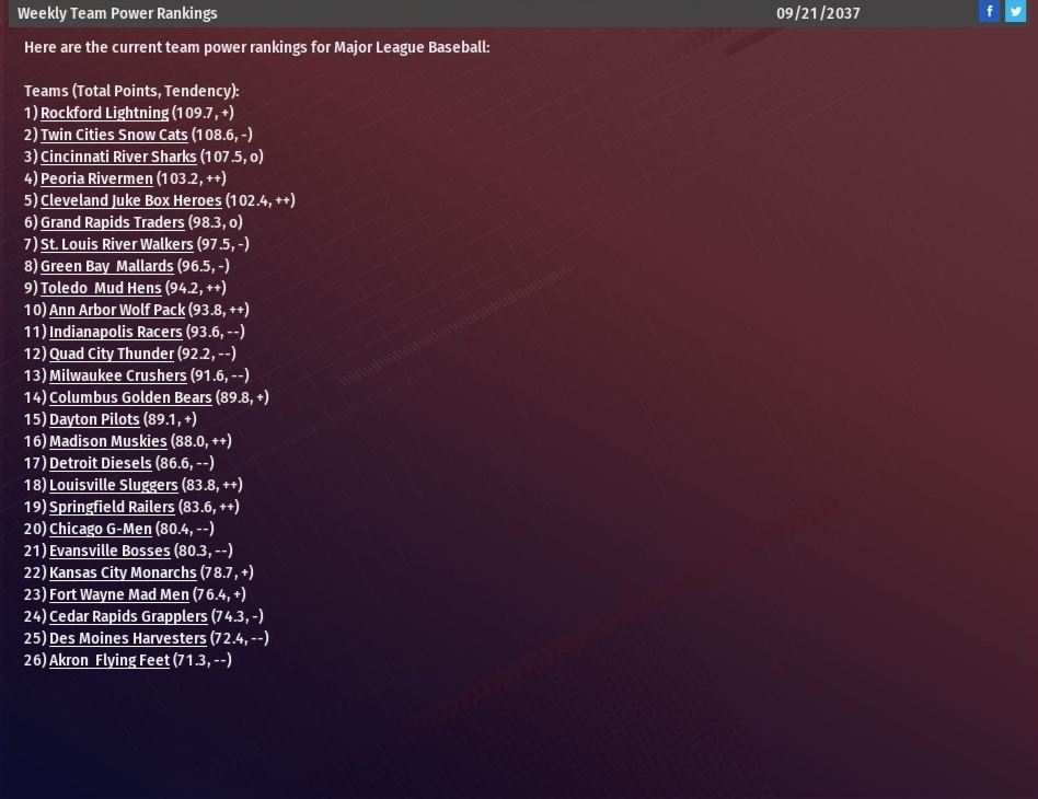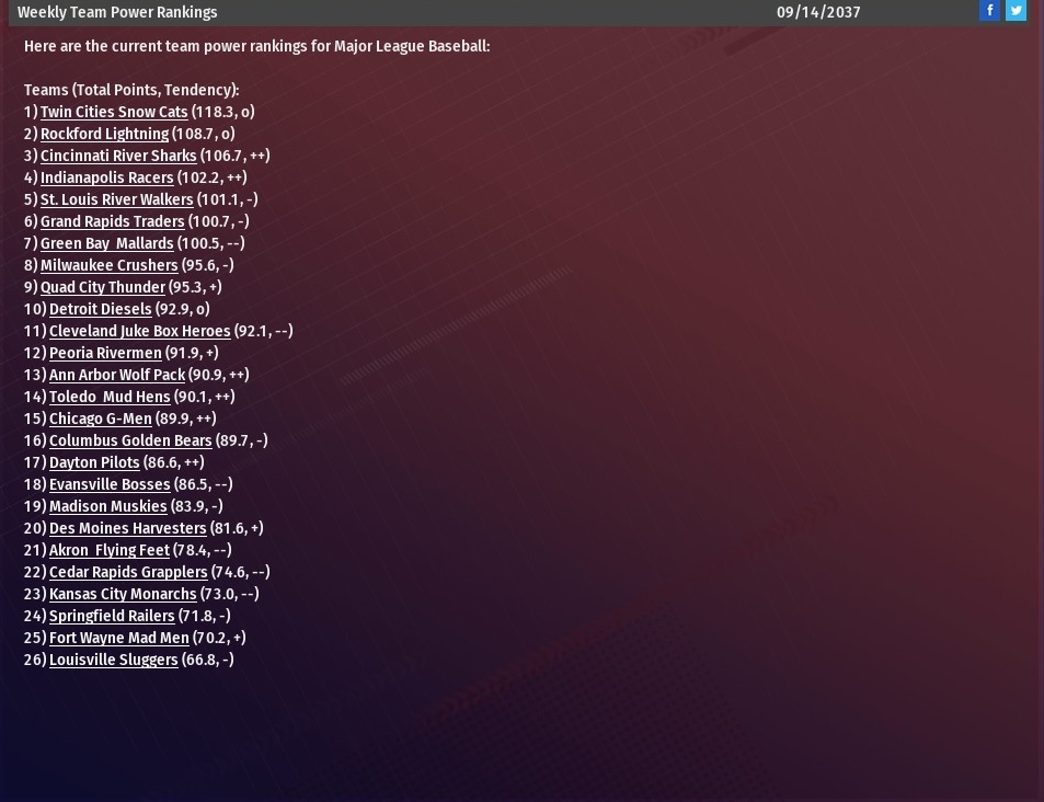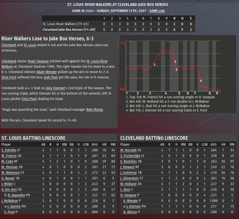 Tied 3-3, Cleveland roughed up St. Louis reliever Elvis Pool for three runs in the bottom of the seventh inning and the Juke Box Heroes went on for a 6-3 win at Cleveland Stadium (1980). The victory gave Cleveland a split of the four-game series. Pool had not given up a run in 11 outings since being called up by the River Walkers on August 26, but this game was different from the first batter. That would be, Luis Ruiz, who Pool hit with an 0-2 pitch to set the Heroes outburst in motion. Joey Kiernan followed with a triple to put Cleveland ahead 4-3. When Mac Horvath followed with a run-scoring double, Pool's day was done and the Heroes led 5-3. Horvath later scored on a two-out wild pitch by Maximilliano Minelli. Both teams had three-run innings earlier in the game. St. Louis tallied three times in the top of the third off Cleveland starter Hugo Vasquez. The Heroes evened in the bottom of the fourth against River Walkers starter Jesse McNaboe. Will Holland plated two of the runs with a double. Ruiz took care of the third with a single. Vasquez worked the first six innings, allowing three runs on eight hits. He struck out six and didn't issue a walk. After that, it was a string of scoreless innings from Adam Wenger, Nate Wilson and Josh Paul to close the game. Wenger (2-6) earned the win. Paul notched his fourth save. |