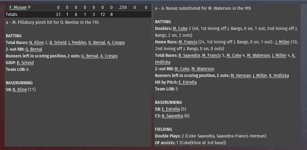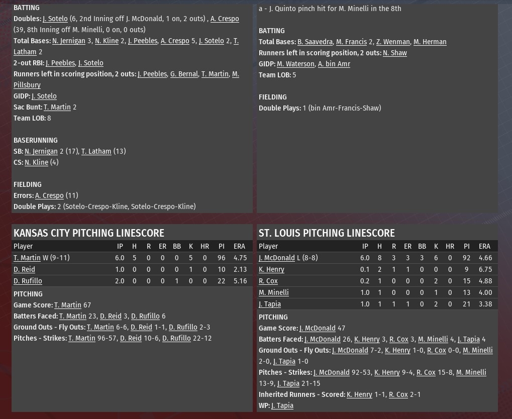 Mark Herman snapped a 1-1 tie with a two-run home run in the top of the eighth inning and that helped St. Louis starting pitcher Ming Xiang become a 15-game winner, as the River Walkers defeated Cleveland 3-1 at Cleveland Stadium (1980). Nick Shaw led off the inning with a single off Juke Box Heroes starting pitcher Juan Munoz. Alex Nunez then pinch-ran for Shaw. Nunez was eliminated when Mark Waterson hit into a fielder's choice. Herman then lined a 3-1 pitch 362 feet over the left-field wall to put St. Louis in front. Solo homers accounted for the game's only other runs. Zachary Puckeridge put Cleveland ahead 1-0 with a homer off Xiang in the bottom of the first. Rookie Mark Waterson tied it in the top of the second with a one-out homer off Heroes starting pitcher Devin Rogers. Xiang (15-6) was impressive allowing one run on five hits over eight innings. He struck out three and didn't walk a batter. Bobby Westerman's scoreless ninth earned him his 24th save. |