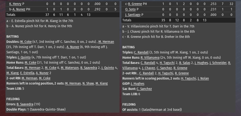 Rookie Mark Waterson had three hits, including a pair of home runs and collected five RBIs to power St. Louis to a 7-3 win over Milwaukee at Miller Park (2020). Nicolas Thibault gave the Crushers an early lead by hitting a solo homer off River Walkers starting pitcher Ming Xiang in the bottom of the first. But St. Louis tied it in the second, Waterson with an RBI double off Milwaukee starter Caleb Walker. It then took the lead in the third. Pitcher Ming Xiang led off with a single and scored on a Mark Herman double. Milwaukee tied it at 2-2 in the bottom of the fourth, belting out a trio of singles off Xiang including one which scored a run by Jose Nieto. Waterson put the Walkers in front for good in the seven with a one-out homer which ended Walker's outing. St. Louis broke it open with a four-run eighth. Marcos Francis drove in the first run with a single off reliever Andy Chavez. Waterson handled the other three with his second homer of the game and 20th of the season. Xiang (14-6) earned the win by allowing two runs on six his over 6.1 innings. He struck out two and walked one. Greg Sones got the final two outs of the seventh. Ron Cox pitched the eighth, allowing a run on an Andy Burhoe homer. Jose Tapia (0.2 IP) started the ninth and got two outs,but allowed a run. Elvis Pool faced one batter, pinch-hitter Corey Flowe, and struck him out for his first save at the major-league level. Last edited by rink23; 03-03-2022 at 05:35 AM. |