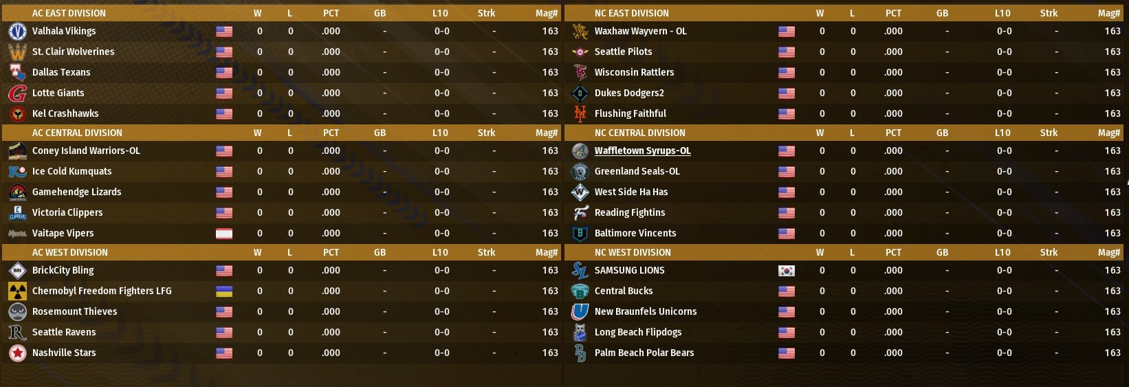 Waxhaw was hoping to salvage something from the season with a less than optimal overall experience by grabbing the OL crown. Down the stretch, they ended up running in place against OL competition, win one/lose one; which allowed Brooklyn the opening to retake the lead and grab the Gold tier crown. Overall, Brooklyn nabbed a bye into the LDS, and could face Shinbone should they win the wild card game. Port Ruppert got a wild card berth in the other conference for 3 OL teams in the post season. at the other end, Columbia will head back to Silver next season |