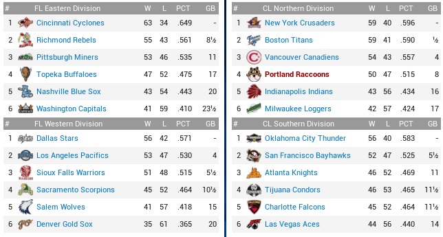 The boys – whatever was left of them – were sent off to Canada to compete with the smelling Elks, which could hardly go well. The Elks had fallen back to third place in the North, but they had eight free wins coming up in the next 11 games. Holding the third place in both runs scored and runs allowed, the Canadiens had a solid team throughout, and they were also already 2-1 against Portland this season. Projected matchups: Bill Conway (2-5, 3.36 ERA) vs. Juichi Fujita (11-4, 3.16 ERA) Hector Santos (2-7, 4.28 ERA) vs. Bill King (5-5, 5.63 ERA) Colin Baldwin (4-5, 4.68 ERA) vs. Jimmy Sjogren (2-4, 4.06 ERA) Jack Berry (6-6, 5.06 ERA) vs. Rod Taylor (8-4, 3.52 ERA) Sjogren will be the first left-hander we’ll see in a while. The Elks had only one injury, outfielder Don Cameron, who had batted .352 and still hadn’t led his own team, as Ray Gilbert, the pest of pests, was batting .362 with ten homers, but had missed a few weeks of games. Game 1 POR: CF Sambrano – 2B Palmer – LF J. Alexander – C D. Alexander – RF Bednarski – 1B Quebell – 3B Rodgers – SS Whitehouse – P Conway VAN: RF K. Evans – SS Sharp – 1B Gilbert – CF Holland – 3B Suzuki – LF E. Garcia – 2B C. Aguilar – C Hurtado – P Fujita To the home crowd’s disbelief, Juichi Fujita not only allowed a leadoff single to Sandy Sambrano, but also issued three walks in the first innings to concede two runs on a bases-loaded walk to Bednarski and a groundout by Quebell, then hit Ken Rodgers, but Whitehouse struck out to keep it at 2-0. Something had been off with Fujita all season, as he came into the game with less strikeouts than Bill Conway. Then there was also the special adventure the Canadiens embarked on by playing Daniel Sharp – always an average third baseman at best – at short as he was entering really old age. It came to bite them in the third inning. D-Alex had opened with a double, and then Fujita – totally out of whack – smacked Bednarski. Quebell grounded to César Aguilar, perfect double play ball, but Sharp dropped the service from Aguilar and the Elks got nobody, while the Coons had the bases loaded with nobody out. And then – Rodgers popped to Sharp at short, no accident this time, and Whitehouse lobbed softly out to Ross Holland in shallow center. CONWAY came through, though, and singled to left center, plating two to run the score to 4-0. However, it was still CONWAY pitching, too. Fujita (!) hit a single to get the Elks going in the bottom 4th, and Kurt Evans and Daniel Sharp added two more singles to score a run before Ray Gilbert hit into an inning-ending double play. At least Fujita’s shenanigans were ended forcefully in the fourth inning: Adrian Quebell whacked a 2-out, 3-run homer and after a walk to Rodgers, Fujita was removed from the game. Michael Palmer homered off Lou Cannon in the fifth to get the score to 8-1, but Cannon became the second Vancouver pitcher to single off Conway in the bottom of the inning. Conway got his revenge, though, leading off the top 7th with a double off Cannon. Sambrano got on, and Dylan Alexander romped a 3-run homer of his own to put the Raccoons into double digits. Bill Conway not only had a high scoring effort behind himself, but also pitched for long enough to come to the plate five times and to pitch into the ninth inning. Unfortunately, he couldn’t get through and loaded the bases with a single and two walks. George Youngblood had ONE job to do with two outs, and get Kurt Evans. Instead, he balked, then walked Evans and TWO more batters before the game finally ended. 12-4 Critters. Sambrano 3-5, BB, 2B; Palmer 2-5, BB, RBI; D. Alexander 3-6, HR, 3 RBI; Quebell 2-5, HR, 4 RBI; Rodgers 1-2, 2 BB; Conway 8.2 IP, 9 H, 4 R, 4 ER, 4 BB, 6 K, W (3-5) and 2-5, 2B, 2 RBI; Youngblood! YOUNGBLOOD!! HAAARGGHH!! I assume my furious screams could be heard in Canada all the way from Portland… Game 2 POR: 2B Sambrano – SS Palmer – LF J. Alexander – C D. Alexander – RF Bednarski – 1B Quebell – 3B Rodgers – CF Seeley – P Santos VAN: RF K. Evans – SS Sharp – 1B Gilbert – CF Holland – 3B Suzuki – LF E. Garcia – 2B C. Aguilar – C Baca – P B. King Santos didn’t allow a hit in the first three innings, but Evans opened the fourth with a double to right. Sharp struck out, and then Santos totally by accident hit Gilbert, and this was totally unrelated to Bednarski getting hit again in the second inning. Ross Holland took revenge in his way, hit a single to center that scored Evans, and that was the first run in the game. The Coons would load the bases in their next attempt with a leadoff single by Quebell, walks drawn by Rodgers and Sambrano, but Palmer flew out to fairly deep rightfield to leave everybody on base. Bases loaded again in the sixth as D-Alex walked and Bednarski and Quebell both singled. Rodgers with one out stayed out of the double play by a whisker’s width when he grounded to Sharp, bringing in the tying run before Seeley was another obvious and sad third out. Santos needed every bit of the eight innings of 1-run ball he pitched in this game to get a chance at an elusive win. The Coons had Rodgers and Seeley on base in the ninth with one out. Bowen batted for Santos, but flew out to left, but Sambrano came through with a bloop single that plated Rodgers with the go-ahead run. Palmer drove in Seeley with a single, before John Alexander completely exploded closer Pedro Alvarado with a booming 3-run homer! Five runs with two outs in the ninth, with the Coons having their own stutterer in the bottom of the inning. Vega put two on while getting two outs, with lefty Enrique Garcia getting to face Sugano. The count ran full before Garcia struck out on a 3-2 right down the middle, glaring in disbelief. 6-1 Coons. Palmer 2-5, RBI; J. Alexander 3-5, HR, 3 RBI; Quebell 2-4; Santos 8.0 IP, 3 H, 1 R, 1 ER, 1 BB, 7 K, W (3-7); Game 3 POR: 1B Sambrano – 2B Palmer – LF J. Alexander – RF Bednarski – C Bow