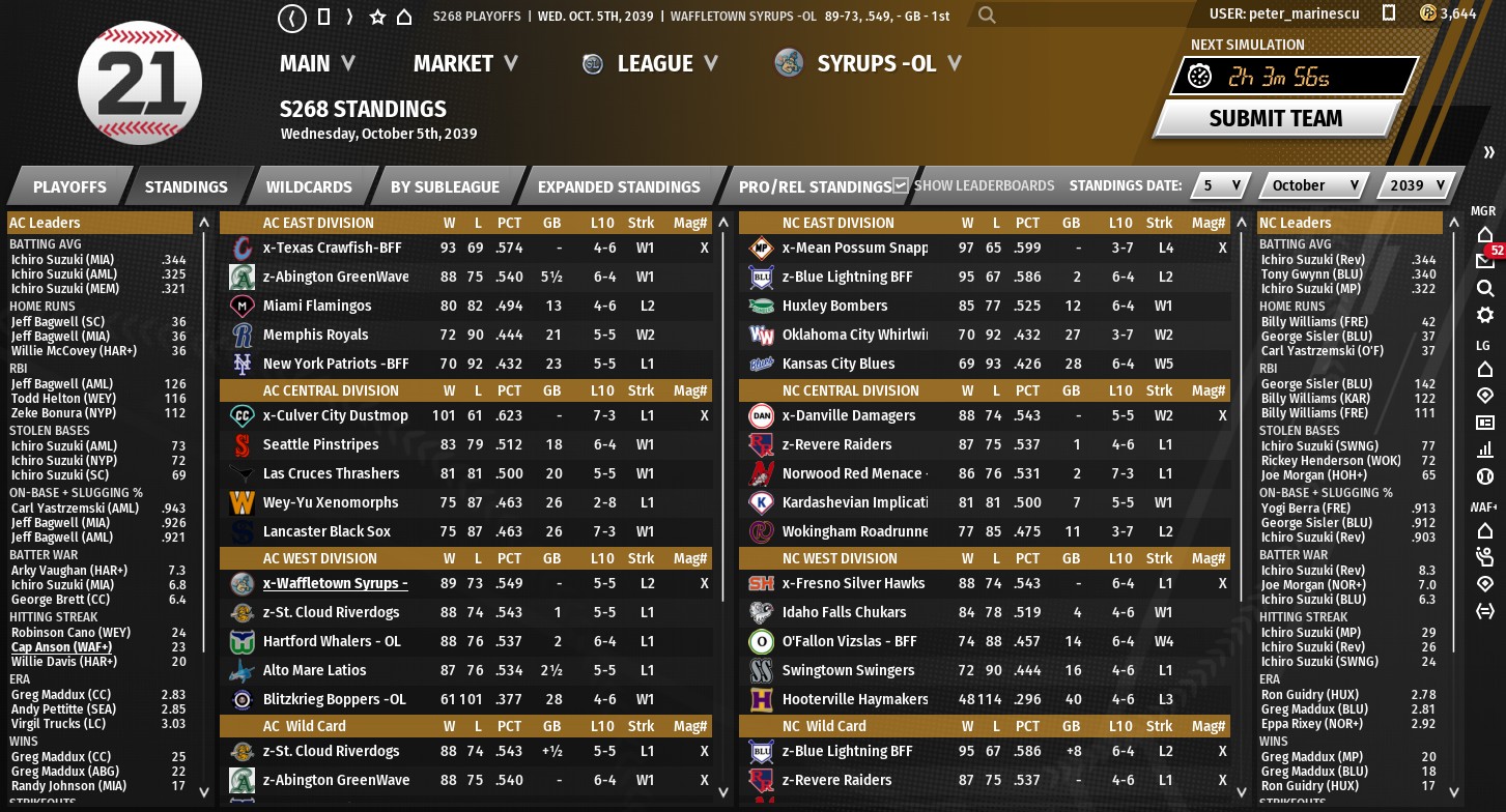 While Norwood made the most of their OL games, they unfortunately fell 3 games short of the 10 game requirement. Hartford takes the crown by taking care of business down the stretch (taking 4 of 6 from Waffletown). Overall, Waffletown backed into the division title with an ugly 13-16 final months of Sep/Oct, and managed to sit atop with a slim 1 game lead. When game 162 finished, Hartford sat at 87-75, and in a three-way tie for the final wild card game with Alto Marie Latios and Abington GreenWave. I'm not sure how that three-way tie breaker is setup (it's not a round-robin, everyone plays everyone style), but Hartford won their game against Alto Marie, then went on to face Abington, but lost that game; so Abington advances to the wild card. Norwood had a nice turnaround, going from barely above the relegation zone, to just missing the wild card by a single game. And in the foundation of the league, Hooterville and Blitzkrieg will be relegated back to Bronze. Waffletown will be the lone playoff representative from OL. |