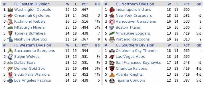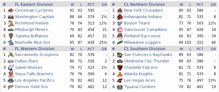 Going to Vancouver was another chilly experience. We were held to two hits in the first eight innings and didn’t score until Johnston bashed a 2-run homer in the ninth. Too little, too late, 5-2 loss. Powell’s penultimate game of the season was up next. He had a hard fight and allowed two homers for five runs in five innings. The Raccoons were down 5-1 after six, but chained together in the seventh to tie it. Then in the eighth, they loaded the bases again with one out. Hoyt Cook stepped in to pinch hit and grand slammed the Raccoons to a 9-5 lead – it was his first home run in the majors. The Canadiens hit two solo homers off Wright in the eighth, but he held on to get the 9-7 win in. For the last five games of the season, Johan Dolder came back from the DL to take back the centerfield job. Anderson was a good defensive player, but his production was dreading. Well, Dolder’s was as well, but he locked down centerfield hard and the 25 points he was below Anderson in batting he – I felt – got back in with stellar defense on the grass. Ed Sullivan was the hero in game 3 in Vancouver, launching a 3-run homer that won the game, 4-2. Ben Green actually got to save this one, facing a solid lefty opposition in the ninth. Ned Ray made his final start in the fourth game, picking up the loss, as the Raccoons went down 5-1, again failing to capitalize from two bases loaded situations with less than two outs, including in the top 9th, where they filled the bags with no outs and then Johnston, Simon, and Lopez failed to move anything, racking up two K’s and a pop up. Still, the goal of putting up at least a .400 season was accomplished. One meaningless series against the Crusaders was left, where both teams could not gain or lose anything. In the CL South, the Bayhawks and Thunder would go directly against each other for the top spot. The Bayhawks needed a sweep to reach the postseason over Oklahoma City. In the FL West, Cincinnati was through already, but in the East, the Scorpions were one game ahead of the Wolves – also facing them! Even more crazy, the Dallas Stars were only two games back and faced the Gold Sox. At best they could reach a three-way tie. What would happen then? Would the universe explode? The Raccoons still had very few things they could achieve, though. Pedro Sánz was only three points behind Boston’s Shawn Gilmore to become the best slugger of the season. Ben Simon had already won a title, albeit a bad one. With 137 K’s so far, he was leading in that category by a sound margin. Most pitching categories had been won by Juan Correa of the Bayhawks, who had shredded through opponents’ lineups all year long. He had won *33* games already. What could go wrong? For the Crusaders, much went wrong. They lost their starter Mark Lee to a back injury after two innings – postseason in jeopardy. And they were rapped by the Raccoons, as Sánz was 3-4 with a pair of doubles in the 8-4 win. This continued the next day with a 2-0 win, where Ben Simon plated both runs, one in the first, and one with a solo homer in the sixth. What about the postseason duels? The Bayhawks had taken the first two from Oklahoma and the two were tied. The last game was truly a decider here, while in the FL East the Wolves and Scorpions had split the first two, Scorpions still up by one, and Dallas had beaten Denver twice and also was only one game back. The three-way tie was still possible! Maloney had contracted a mild abdominal strain in the 2-0 win over New York and missed the last game. The Raccoons did not sweep the Crusaders, but lost 2-1. Johan Dolder struck out with a runner on to end the season. The Bayhawks and Thunder went at it, hard: the Bayhawks swept the Thunder with a 13-10 win and advanced to the LCS. In the Federal League? The Stars did what they had to, winning 4-1 against the Gold Sox, but the Scorpions beat the Wolves 7-5 on a 6-run bottom 2nd, qualifying to go against the Cyclones. We had gone 67-95, but more importantly, 45-45 against our division. The CL South had really hit us hard with a 14-40 (!!) record. Our pythagorean record? 79-83. There is your .500 team, almost. In other news: September 26 – Sergio Martiel of the Capitals gets to 20 games with a hit in a row after going 4-4 against the Buffaloes. Martiel is hitting .315 with 101 RBI and five homers. Still, the Capitals lose the game, 6-5, and the fight for the playoffs, bringing the Cyclones’ magic number to zero. The Cincinnati Cyclones didn’t even play on this day to make it to the postseason. September 28 – The Buffaloes chill Martiel’s streak at 21 games. |