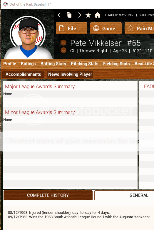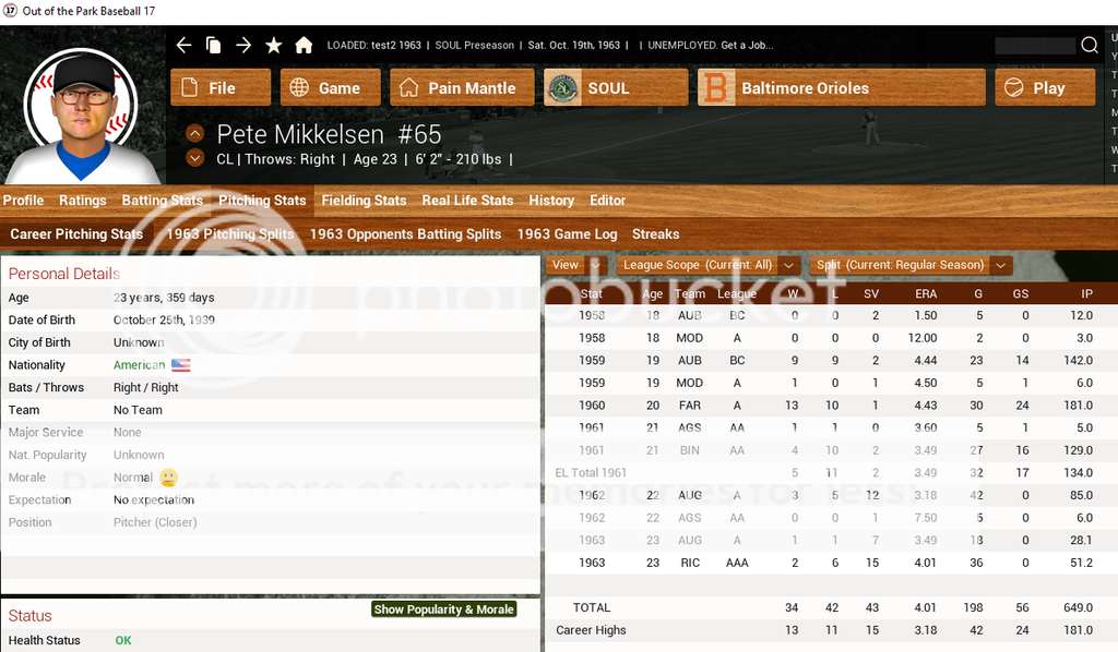 When using historical minors it is my experience that any players who missed your starting year IRL but subsequently played in a season after that will show up in the free agent pool. For example, I started a league in 1963, at the end of the season Phil Niekro showed up in the Free Agent pool, he played in the minors in 1961 and 1962, but missed 1963 due to Military service Also the minor league are very volatile in that age, with teams shifting around, folding, new teams appearing. If you expecting there to never be any free agents, that isn't going to happen. There will always be players that teams get rid of or that move to different teams, minor league players back then could pretty much just go where ever they wanted in general when their contract ran out and no matter what era it is, there were always guys that teams simply said, "go home Kid, you ain't gonna make it" I'm really interested in possibly running a online league using real historical minors, and I've been looking for a rhyme or reason why some of the players end up in the Free Agent pool and I can't figure it out. The ones that concern me are the guys who played in the minors that year, had a pretty good or very good season, their team moved and they ended up in the free agent pool with nothing in their history detailing how they got there. It would seem these players would be retained by their franchise