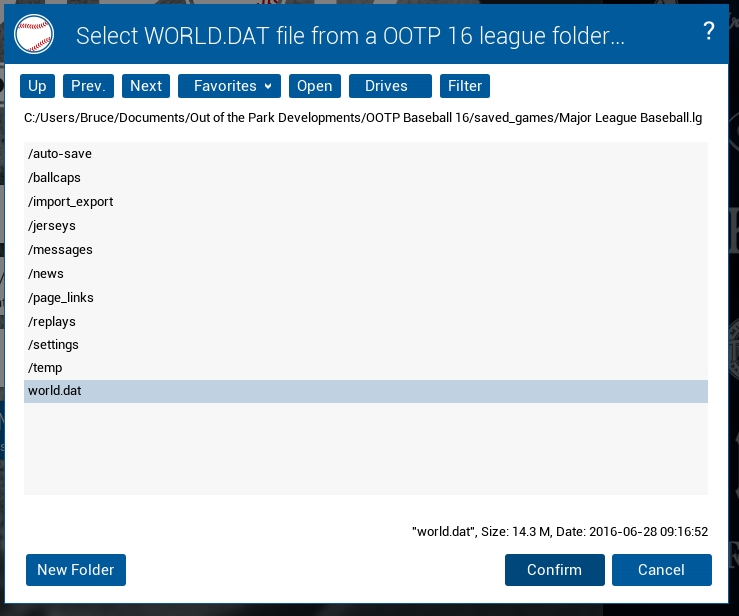 Here are the steps. The tricky thing may be to locate the world.dat file in the OOTP16 saved game folder. That may require some navigation up and down the list of folders (although in this demonstration, the game knew where to go right away); use the up button and double-click folders until you find the world.dat file. Answer a few questions after that and the game will take it from there. You will have to check your league in 17 carefully, as the process is not foolproof.