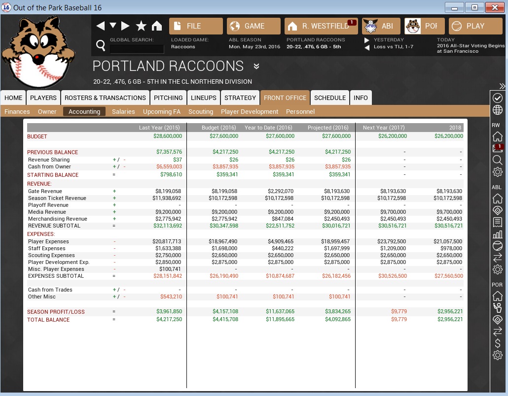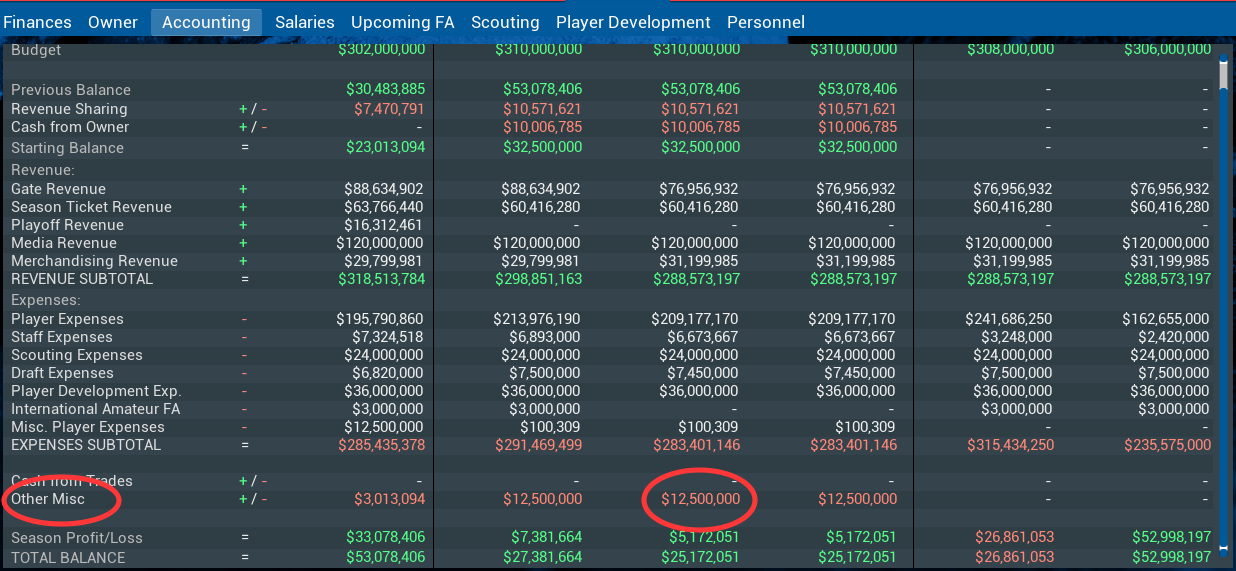 Additional things that might show up here are any commissioner adjustments that are made. In our league we can do stadium upgrades, send coaches to seminars to upgrade them, and we have to pay for each Rule 5 Draftee we take. There are also league fines, penalties, and such that would be included in this number. Last edited by Jockbrokers; 06-09-2019 at 05:07 PM. Reason: accuracy |