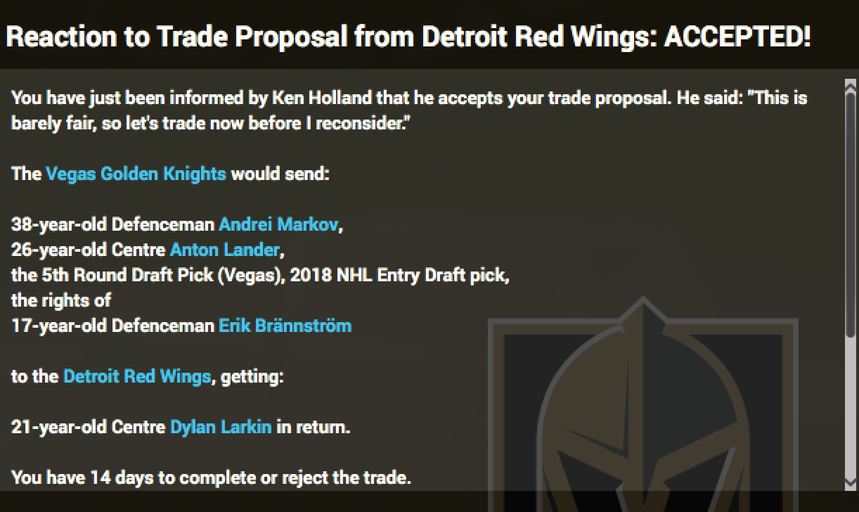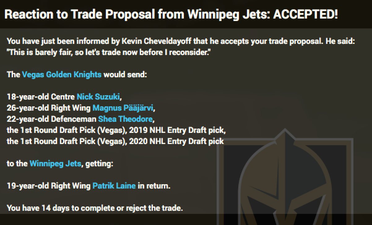 100% agree with you, I asked the Dev's quite a few times about the trading logic, and in fairness they do have to set some rules for trades to happen... The one that bugs me the most is the ability to trade for or away players with NMC or NTC, or when i get a player injured for months i can trade him for a player on the same level... I'm sure you heard of this guy called Gretzky... he got traded ;-) |